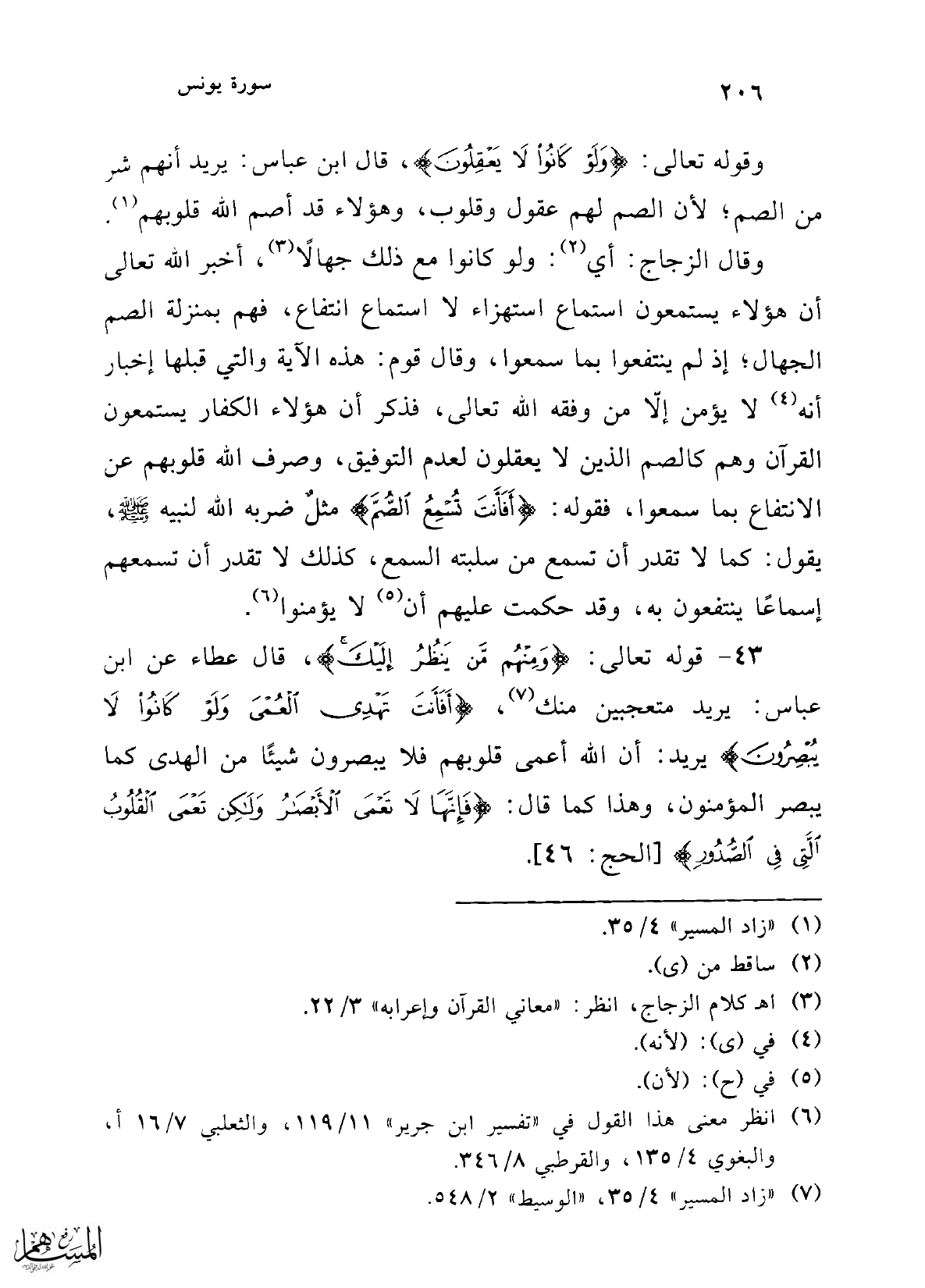 وقال الزجاج: أي (¬2): ولو كانوا مع ذلك جهالًا (¬3)، أخبر الله تعالى أن هؤلاء يستمعون استماع استهزاء لا استماع انتفاع، فهم بمنزلة الصم الجهال؛ إذ لم ينتفعوا بما سمعوا، وقال قوم: هذه الآية والتي قبلها إخبار أنه (¬4) لا يؤمن إلّا من وفقه الله تعالى، فذكر أن هؤلاء الكفار يستمعون القرآن وهم كالصم الذين لا يعقلون لعدم التوفيق، وصرف الله قلوبهم عن الانتفاع بما سمعوا، فقوله: {أَفَأَنْتَ تُسْمِعُ الصُّمَّ} مثلٌ ضربه الله لنبيه - صلى الله عليه وسلم -، يقول: كما لا تقدر أن تسمع من سلبته السمع، كذلك لا تقدر أن تسمعهم إسماعًا ينتفعون به، وقد حكمت عليهم أن (¬5) لا يؤمنوا (¬6).