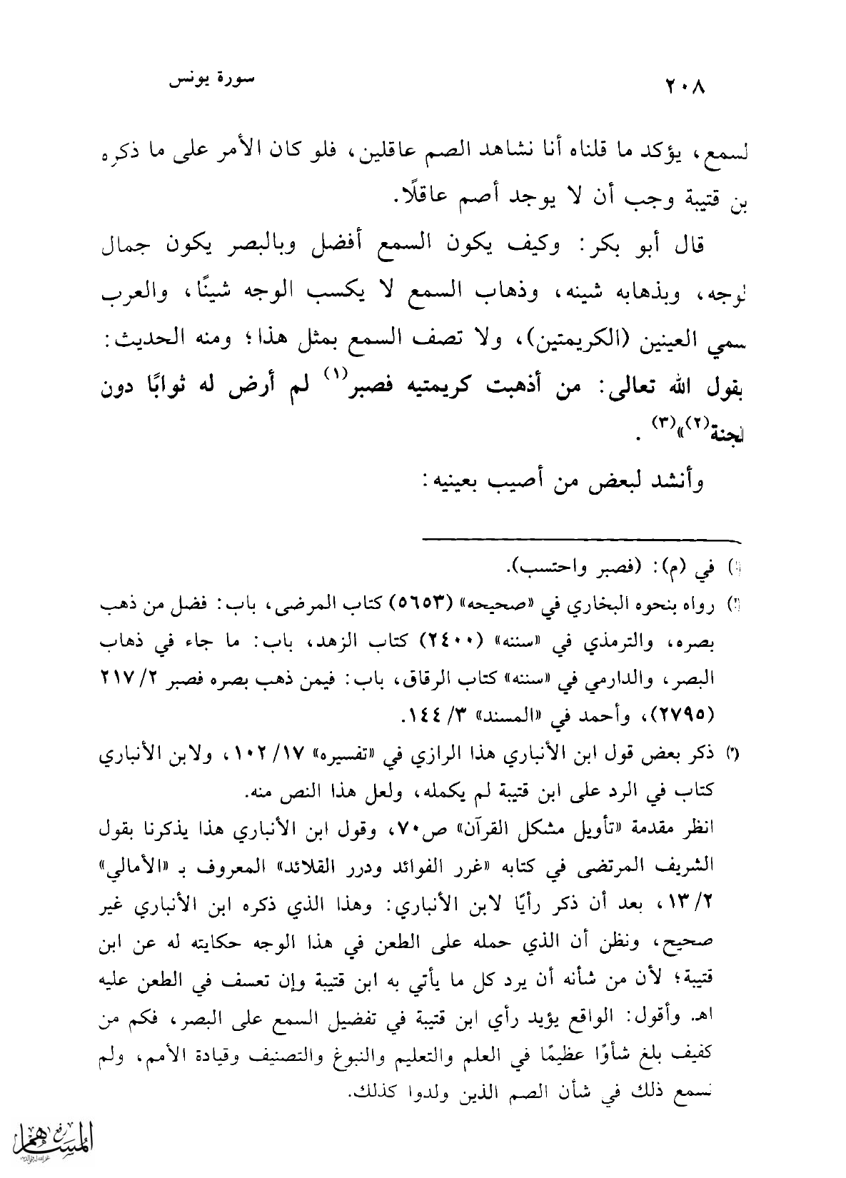 انظر مقدمة "تأويل مشكل القرآن" ص70، وقول ابن الأنباري هذا يذكرنا بقول الشريف المرتضى في كتابه "غرر الفوائد ودرر القلائد" المعروف بـ"الأمالي" 2/ 13، بعد أن ذكر رأيًا لابن الأنباري: وهذا الذي ذكره ابن الأنباري غير صحيح، ونظن أن الذي حمله على الطعن في هذا الوجه حكايته له عن ابن قتيبة؛ لأن من شأنه أن يرد كل ما يأتي به ابن قتيبة وإن تعسف في الطعن عليه اهـ. وأقول: الواقع يؤيد رأي ابن قتيبة في تفضيل السمع على البصر، فكم من كفيف بلغ شأوًا عظيمًا في العلم والتعليم والنبوغ والتصنيف وقيادة الأمم، ولم نسمع ذلك في شأن الصم الذين ولدوا كذلك.