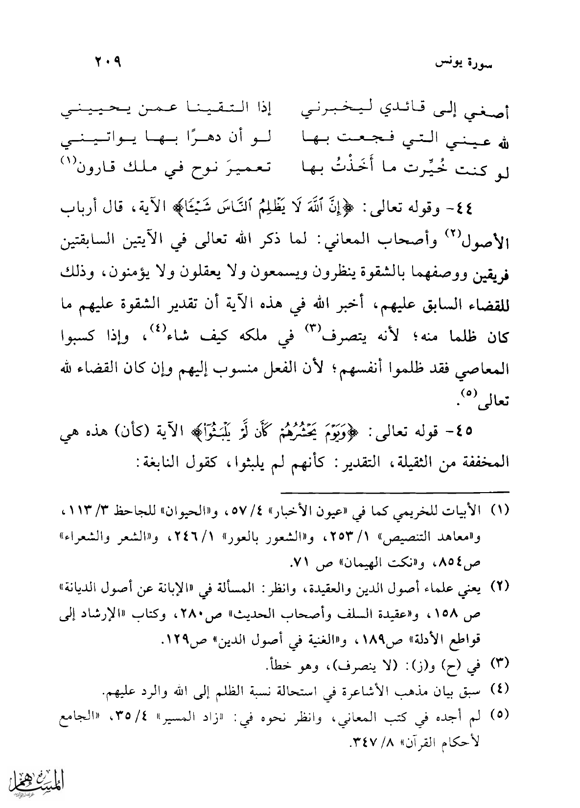 44 - وقوله تعالى: {إِنَّ اللَّهَ لَا يَظْلِمُ النَّاسَ شَيْئًا} الآية، قال أرباب الأصول (¬2) وأصحاب المعاني: لما ذكر الله تعالى في الآيتين السابقتين فريقين ووصفهما بالشقوة ينظرون ويسمعون ولا يعقلون ولا يؤمنون، وذلك للقضاء السابق عليهم، أخبر الله في هذه الآية أن تقدير الشقوة عليهم ما كان ظلما منه؛ لأنه يتصرف (¬3) في ملكه كيف شاء (¬4)، وإذا كسبوا المعاصي فقد ظلموا أنفسهم؛ لأن الفعل منسوب إليهم وإن كان القضاء لله تعالى (¬5).
