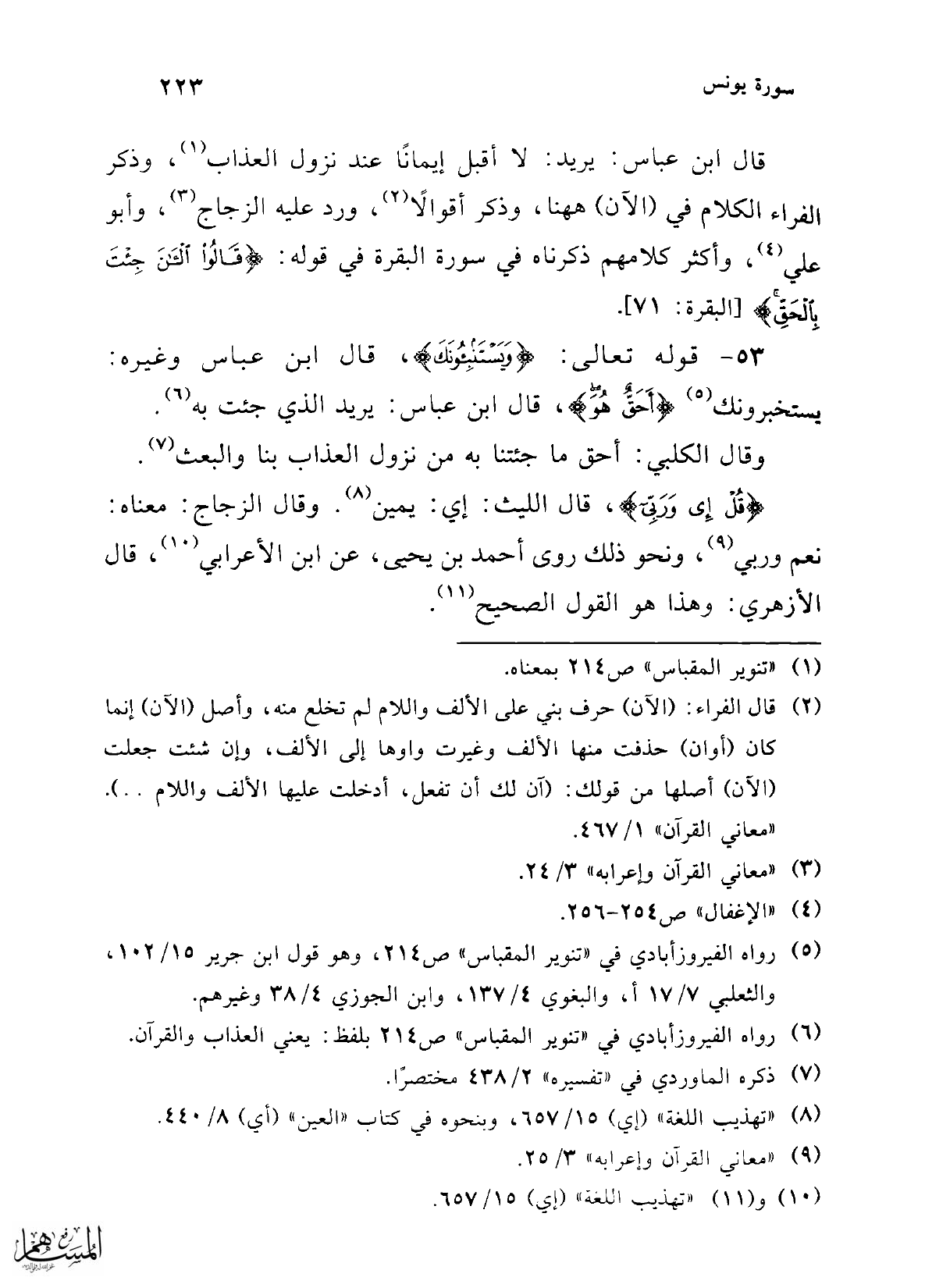 53 - قوله تعالى: {وَيَسْتَنْبِئُونَكَ}، قال ابن عباس وغيره: يستخبرونك (5) {أَحَقٌّ هُوَ}، قال ابن عباس: يريد الذي جئت به (6).