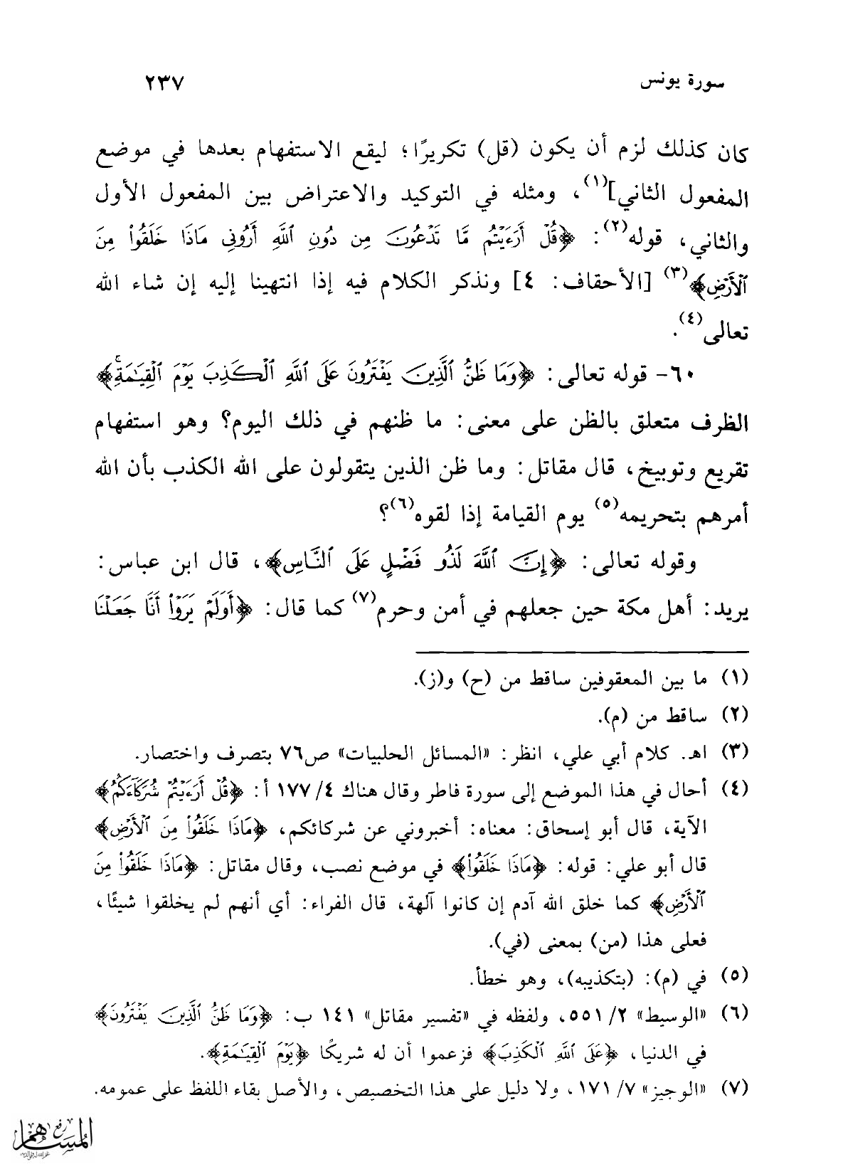 كان كذلك لزم أن يكون (قل) تكريرًا؛ ليقع الاستفهام بعدها في موضع المفعول الثاني] (¬1)، ومثله في التوكيد والاعتراض بين المفعول الأول والثاني، قوله (¬2): {قُلْ أَرَأَيْتُمْ مَا تَدْعُونَ مِنْ دُونِ اللَّهِ أَرُونِي مَاذَا خَلَقُوا مِنَ الْأَرْضِ} (¬3) [الأحقاف: 4] ونذكر الكلام فيه إذا انتهينا إليه إن شاء الله تعالى (¬4).