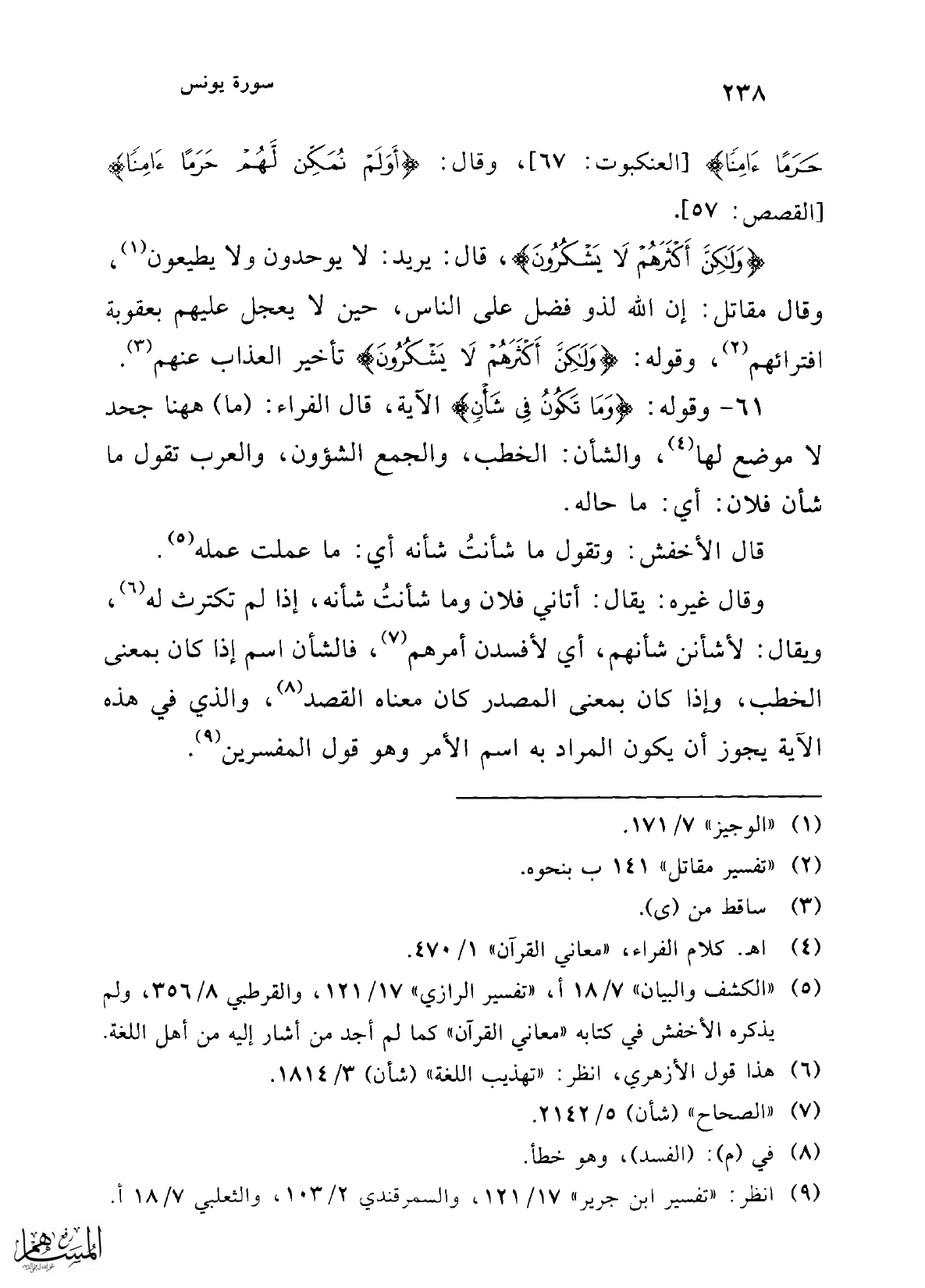 (¬5) "الكشف والبيان" 7/ 18 أ، "تفسير الرازي" 17/ 121، والقرطبي 8/ 356، ولم يذكره الأخفش في كتابه "معاني القرآن" كما لم أجد من أشار إليه من أهل اللغة.