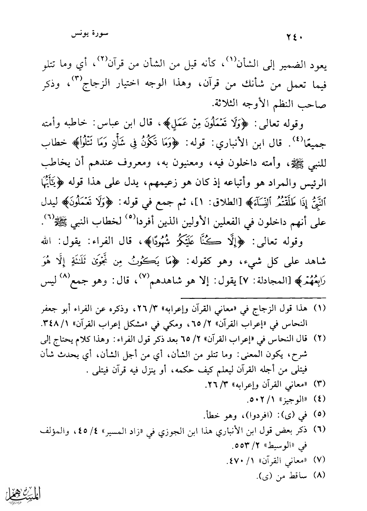وقوله تعالى: {وَلَا تَعْمَلُونَ مِنْ عَمَلٍ}، قال ابن عباس: خاطبه وأمته جميعًا (¬4). قال ابن الأنباري: قوله: {وَمَا تَكُونُ فِي شَأْنٍ وَمَا تَتْلُو} خطاب للنبي - صلى الله عليه وسلم -، وأمته داخلون فيه، ومعنيون به، ومعروف عندهم أن يخاطب الرئيس والمراد هو وأتباعه إذ كان هو زعيمهم، يدل على هذا قوله {يَا أَيُّهَا النَّبِيُّ إِذَا طَلَّقْتُمُ النِّسَاءَ} [الطلاق: 1]، ثم جمع في قوله: {وَلَا تَعْمَلُونَ} ليدل على أنهم داخلون في الفعلين الأولين الذين أفردا (¬5) لخطاب النبي - صلى الله عليه وسلم - (¬6).