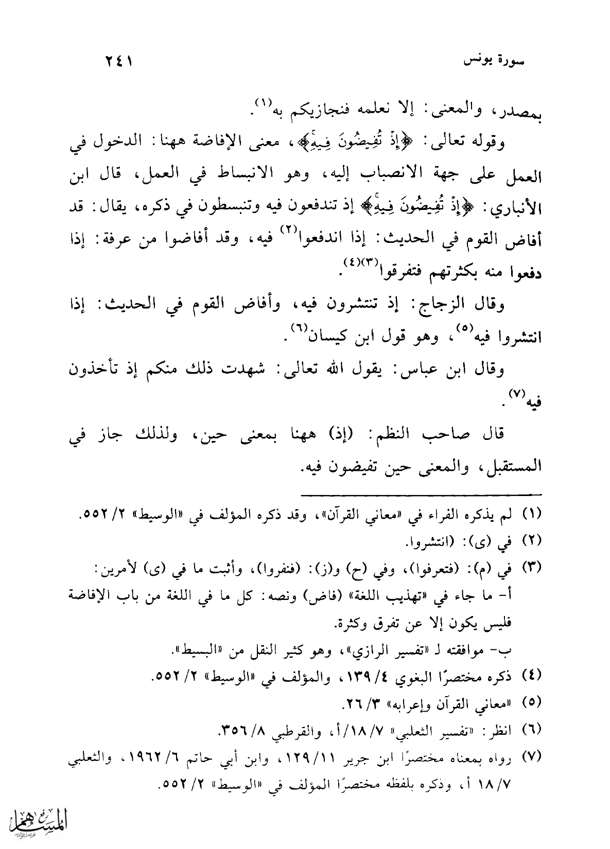 وقوله تعالى: {إِذْ تُفِيضُونَ فِيهِ}، معنى الإفاضة هاهنا: الدخول في العمل على جهة الانصباب إليه، وهو الانبساط في العمل، قال ابن الأنباري: {إِذْ تُفِيضُونَ فِيهِ} إذ تندفعون فيه وتنبسطون في ذكره، يقال: قد أفاض القوم في الحديث: إذا اندفعوا (¬2) فيه، وقد أفاضوا من عرفة: إذا دفعوا منه بكثرتهم فتفرقوا (¬3) (¬4).