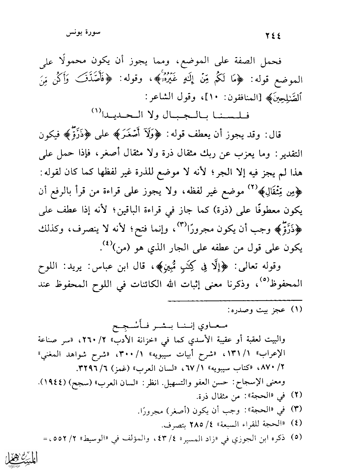 قال: وقد يجوز أن يعطف قوله: {وَلَا أَصْغَرَ} على {ذَرَّةٍ} فيكون التقدير: وما يعزب عن ربك مثقال ذرة ولا مثقال أصغر، فإذا حمل على هذا لم يجز فيه إلا الجر؛ لأنه لا موضع للذرة غير لفظها كما كان لقوله: {مِنْ مِثْقَالِ} (¬2) موضع غير لفظه، ولا يجوز على قراءة من قرأ بالرفع أن يكون معطوفًا على (ذرة) كما جاز في قراءة الباقين؛ لأنه إذا عطف على {ذَرَّةٍ} وجب أن يكون مجرورًا (¬3)، وإنما فتح؛ لأنه لا ينصرف، وكذلك يكون على قول من عطفه على الجار الذي هو (من) (¬4).