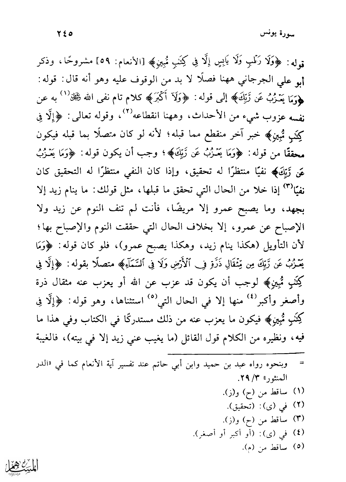 قوله: {وَلَا رَطْبٍ وَلَا يَابِسٍ إِلَّا فِي كِتَابٍ مُبِينٍ} [الأنعام: 59] مشروحًا، وذكر أبو علي الجرجاني هاهنا فصلاً لابد من الوقوف عليه وهو أنه قال: قول: {وَمَا يَعْزُبُ عَنْ رَبِّكَ} إلى قوله: {وَلَا أَكْبَرَ} كلام تام نفى الله عز وجل (¬1) به عن نفسه عزوب شيء من الأحداث، وهاهنا انقطاعه (¬2)، وقوله تعالى: {إِلَّا فِي كِتَابٍ مُبِينٍ} خبرآخر منقطع بما قبله؛ لأنه لو كان متصلًا بما قبله فيكون محققًا من قوله: {وَمَا يَعْزُبُ عَنْ رَبِّكَ}؛ وجب أن يكون قوله: {وَمَا يَعْزُبُ عَنْ رَبِّكَ} نفيًا منتظرًا له تحقيق، وإذا كان النفي منتظرًا له التحقيق كان نفيًا (¬3) إذا خلا من الحال التي تحقق ما قبلها، مثل قولك: ما ينام زيد إلا بجهد، وما يصبح عمرو إلا مريضًا، فأنت لم تنف النوم عن زيد ولا الإصباح عن عمرو، إلا بخلاف الحال التي حققت النوم والإصباح بها؛ لأن التأويل (هكذا ينام زيد، وهكذا يصبح عمرو)، فلو كان قوله: {وَمَا يَعْزُبُ عَنْ رَبِّكَ مِنْ مِثْقَالِ ذَرَّةٍ فِي الْأَرْضِ وَلَا فِي السَّمَاءِ} متصلًا بقوله: {إِلَّا فِي كِتَابٍ مُبِينٍ} لوجب أن يكون قد عزب عن الله أو يعزب عنه مثقال ذرة وأصغر وأكبر (¬4) منها إلا في الحال التي (¬5) استثناها، وهو قوله: {إِلَّا فِي كِتَابٍ مُبِينٍ} فيكون ما يعزب عنه من ذلك مستدركًا في الكتاب وفي هذا ما فيه، ونظيره من الكلام قول القائل (ما يغيب عني زيد إلا في بيته)، فالغيبة