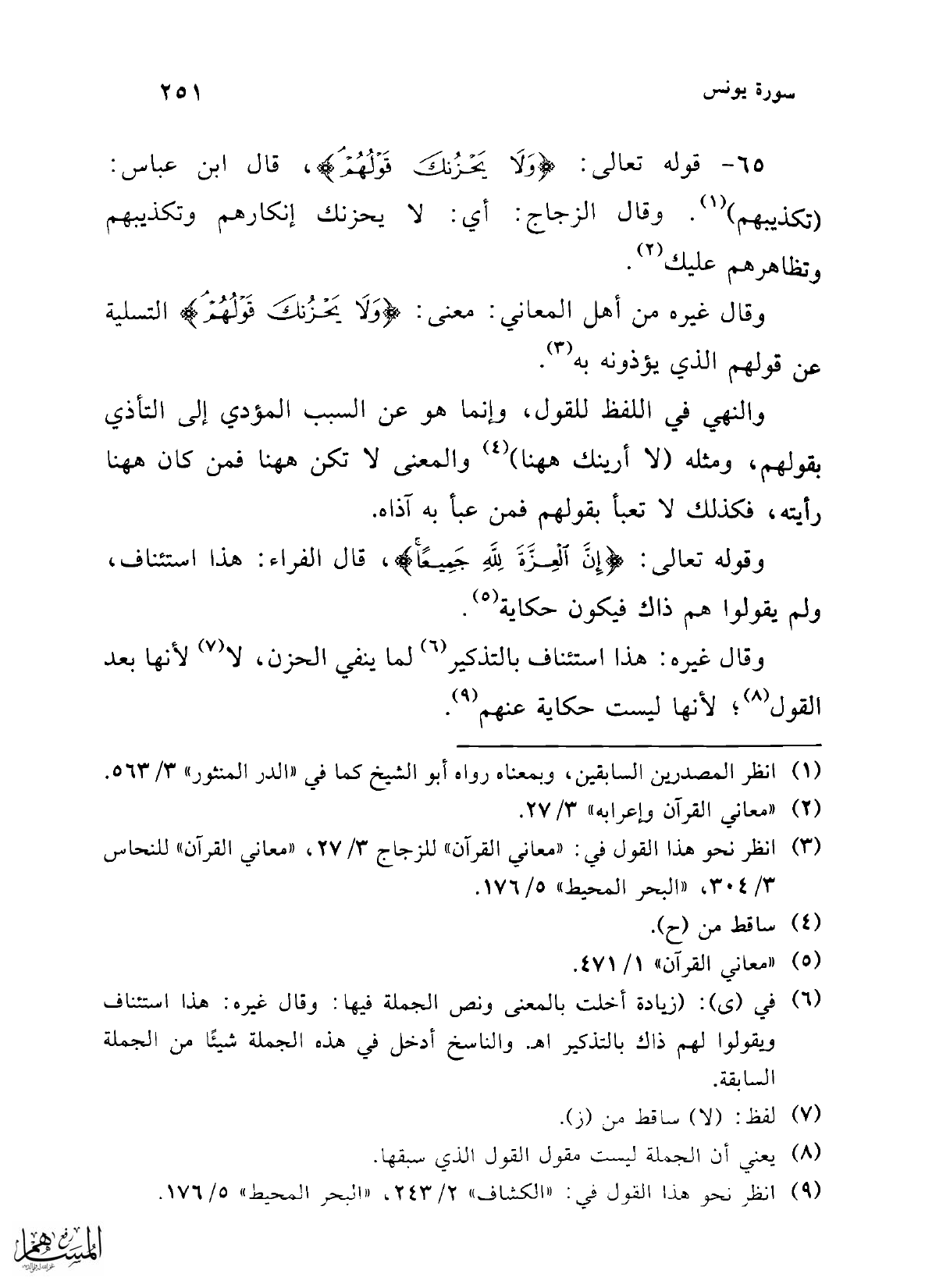 65 - قوله تعالى: {وَلَا يَحْزُنْكَ قَوْلُهُمْ}، قال ابن عباس: (تكذيبهم) (¬1). وقال الزجاج: أي: لا يحزنك إنكارهم وتكذيبهم وتظاهرهم عليك (¬2).