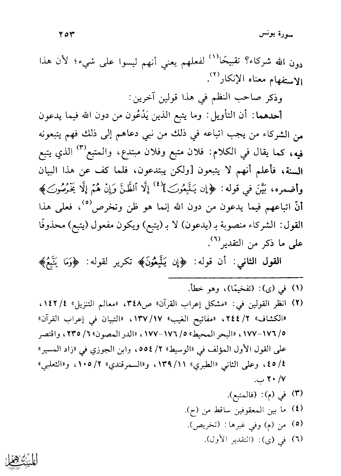 أحدهما: أن التأويل: وما يتبع الذين يَدْعُون من دون الله فيما يدعون من الشركاء من يجب اتباعه في ذلك من نبي دعاهم إلى ذلك فهم يتبعونه فيه، كما يقال في الكلام: فلان متبع وفلان مبتدع، والمتبع (¬3) الذي يتبع السنة، فاعلم أنهم لا يتبعون [ولكن يبتدعون، فلما كف عن هذا البيان وأضمره، بَيَّنَ في قوله: {إِنْ يَتَّبِعُونَ] (¬4) إِلَّا الظَّنَّ وَإِنْ هُمْ إِلَّا يَخْرُصُونَ} أنّ اتباعهم فيما يدعون من دون الله إنما هو ظن وتخرص (¬5)، فعلى هذا القول: الشركاء منصوبة بـ (يدعون) لا بـ (يتبع) ويكون مفعول (يتبع) محذوفًا على ما ذكر من التقدير (¬6).
