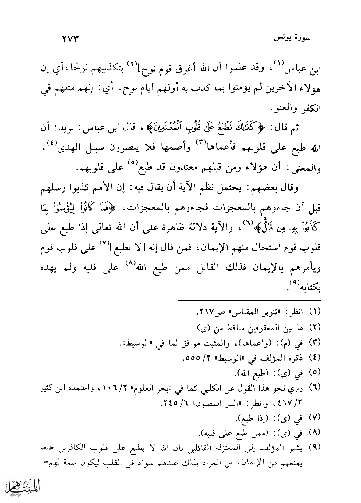 (¬9) يشير المؤلف إلى المعتزلة القائلين بأن الله لا يطبع على قلوب الكافرين طبعًا يمنعهم من الإيمان، بل المراد بذلك عندهم سواد في القلب ليكون سمة لهم =