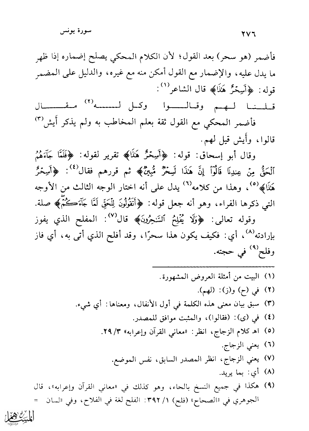 (¬9) هكذا في جميع النسخ بالحاء، وهو كذلك في "معاني القرآن وإعرابه"، قال الجوهري في "الصحاح" (فلح) 1/ 392: الفلح لغة في الفلاح، وفي "لسان =