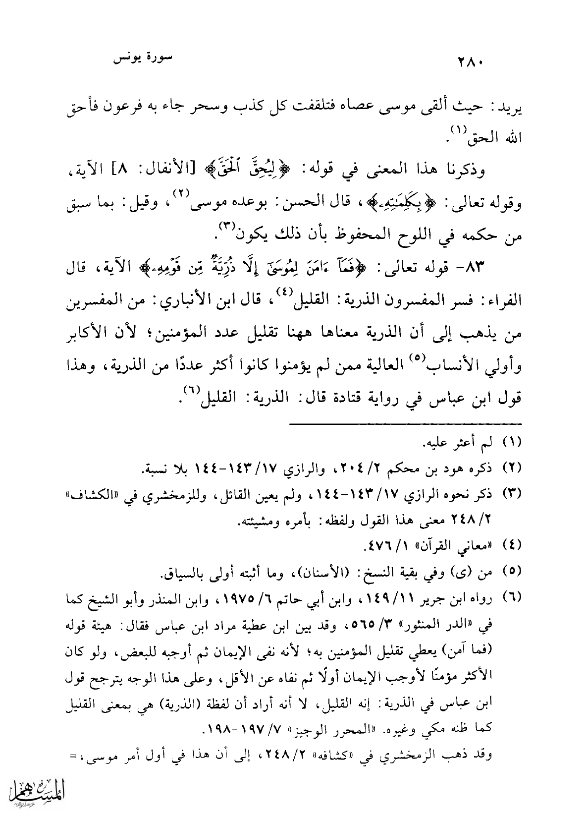 (¬6) رواه ابن جرير 11/ 149، وابن أبي حاتم 6/ 1975، وابن المنذر وأبو الشيخ كما في"الدر المنثور" 3/ 565، وقد بين ابن عطية مراد ابن عباس فقال: هيئة قوله (فما آمن) يعطي تقليل المؤمنين به؛ لأنه نفى الإيمان ثم أوجبه للبعض، ولو كان الأكثر مؤمنًا لأوجب الإيمان أولاً ثم نفاه عن الأقل، وعلى هذا الوجه يترجح قول ابن عباس في الذرية: إنه القليك، لا أنه أراد أن لفظة (الذرية) هي بمعنى القليل كما ظنه مكي وغيره. "المحرر الوجيز" 7/ 197 - 198.