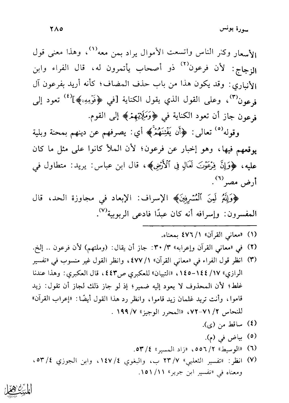 الأسعار وكثر الناس واتسعت الأموال يراد بمن معه (¬1)، وهذا معنى قول الزجاج: لأن فرعون (¬2) ذو أصحاب يأتمرون له، قال الفراء وابن الأنباري: وقد يكون هذا من باب حذف المضاف؛ كأنه أريد بفرعون آل فرعون (¬3)، وعلى القول الذي يقول الكناية [في {قَوْمِهِ}] (¬4) تعود إلى فرعون جاز أن تعود الكناية في {وَمَلَئِهِمْ} إلى القوم.
