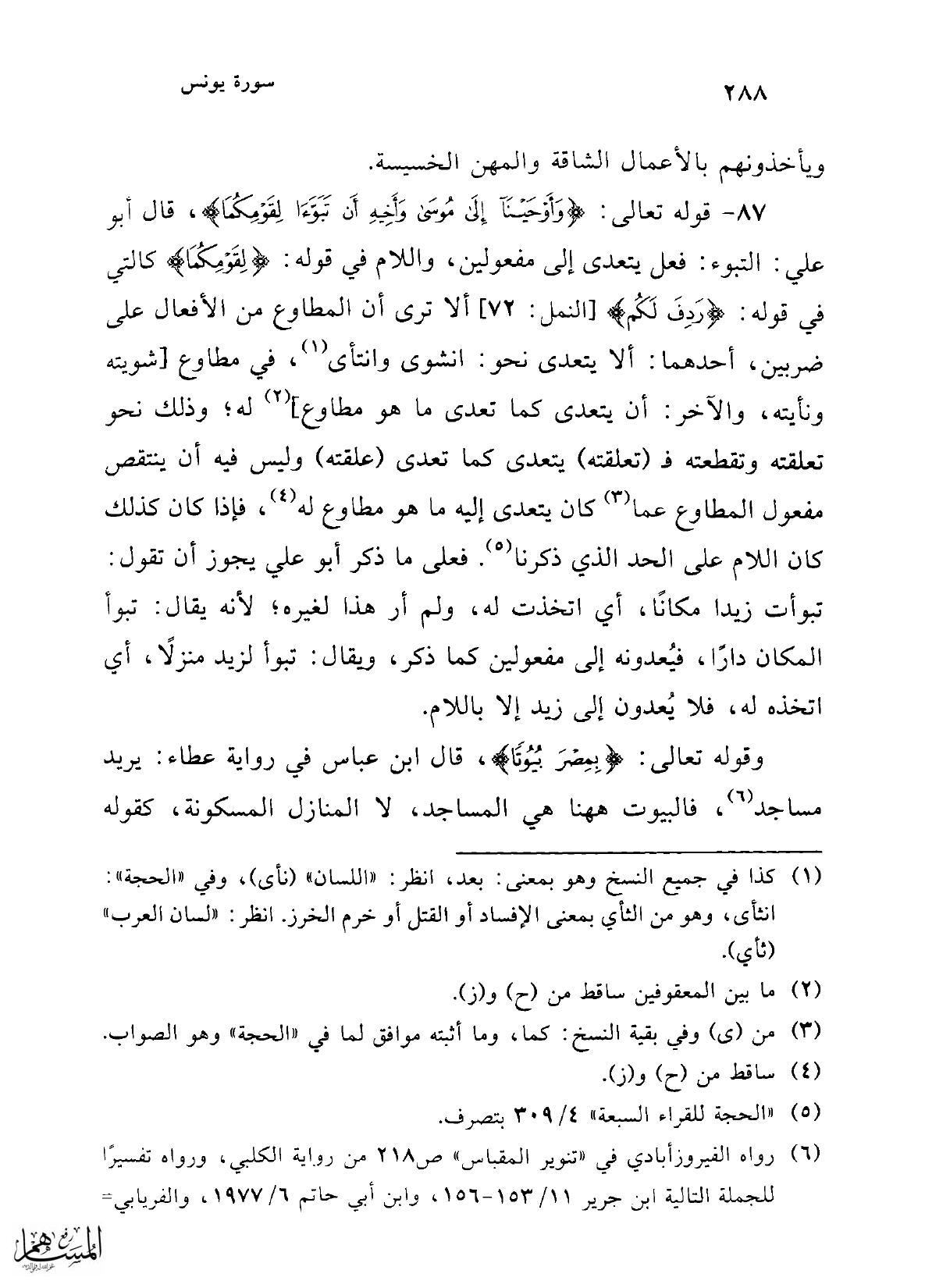 87 - قوله تعالى: {وَأَوْحَيْنَا إِلَى مُوسَى وَأَخِيهِ أَنْ تَبَوَّآ لِقَوْمِكُمَا}، قال أبو علي: التبوء: فعل يتعدى إلى مفعولين، واللام في قوله: {لِقَوْمِكُمَا} في قوله: {رَدِفَ لَكُمْ} [النمل: 72] ألا ترى أن المطاوع من الأفعال على ضربين، أحدهما: ألا يتعدى نحو: انشوى وانتأى (¬1)، في مطاوع [شويته ونأيته، والآخر: أن يتعدى كما تعدى ما هو مطاوع] (¬2) له؛ وذلك نحو تعلقته وتقطعته فـ (تعلقته) يتعدى كما تعدى (علقته) وليس فيه أن ينتقص مفعول المطاوع عما (¬3) كان يتعدى إليه ما هو مطاوع له (¬4)، فإذا كان كذلك كان اللام على الحد الذي ذكرنا (¬5). فعلى ما ذكر أبو علي يجوز أن تقول: تبوأت زيدا مكانًا، أي اتخذت له، ولم أر هذا لغيره؛ لأنه يقال: تبوأ المكان دارًا، فيُعدونه إلى مفعولين كما ذكر، ويقال: تبوأ لزيد منزلاً، أي اتخذه له، فلا يُعدون إلى زيد إلا باللام.