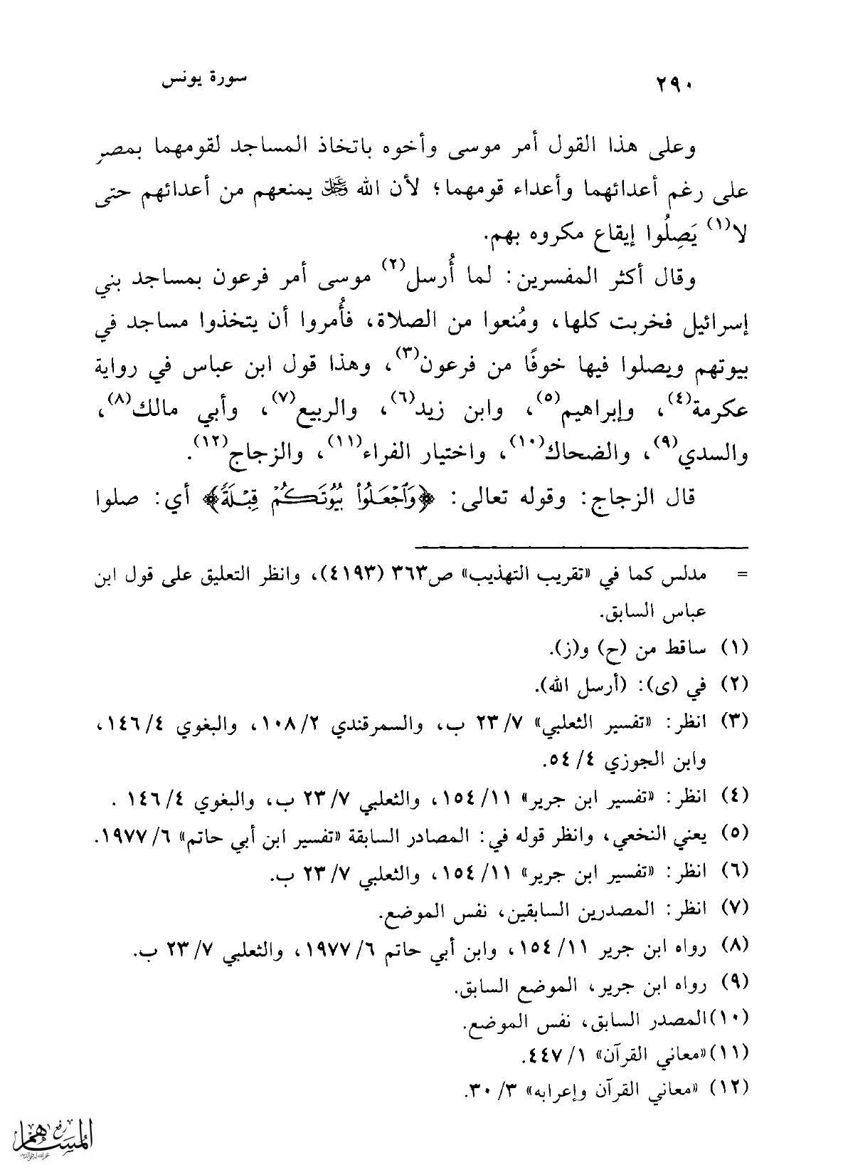 وقال أكثر المفسرين: لما أُرسل (¬2) موسى أمر فرعون بمساجد بني إسرائيل فخربت كلها، ومُنعوا من الصلاة، فأُمروا أن يتخذوا مساجد في بيوتهم ويصلوا فيها خوفًا من فرعون (¬3)، وهذا قول ابن عباس في رواية عكرمة (¬4)، وإبراهيم (¬5)، وابن زيد (¬6)، والربيع (¬7)، وأبي مالك (¬8)، والسدي (¬9)، والضحاك (¬10)، واختيار الفراء (¬11)، والزجاج (¬12).
