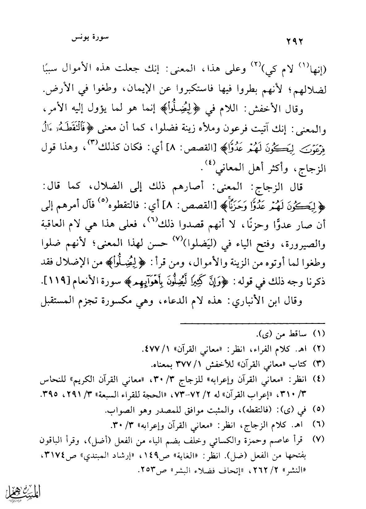 وققال الأخفش: اللام في {لِيُضِلُّوا} إنما هو لما يؤول إليه الأمر، والمعنى: إنك آتيت فرعون وملأه زينة فضلوا، كما أن معنى {فَالْتَقَطَهُ آلُ فِرْعَوْنَ لِيَكُونَ لَهُمْ عَدُوًّا وَحَزَنًا} [القصص: 8] أي: فكان كذلك (¬3)، وهذا قول الزجاج، وأكثر أهل المعاني (¬4).