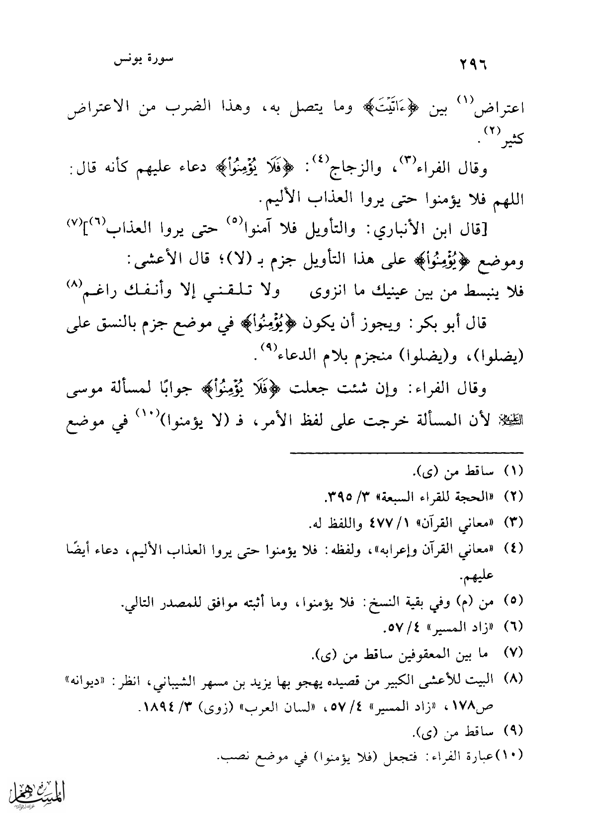 وقال الفراء: وإن شئت جعلت {فَلَا يُؤْمِنُوا} جوابًا لمسألة موسى عليه السلام لأن المسألة خرجت على لفظ الأمر، فـ (لا يؤمنوا) (¬10) في موضع