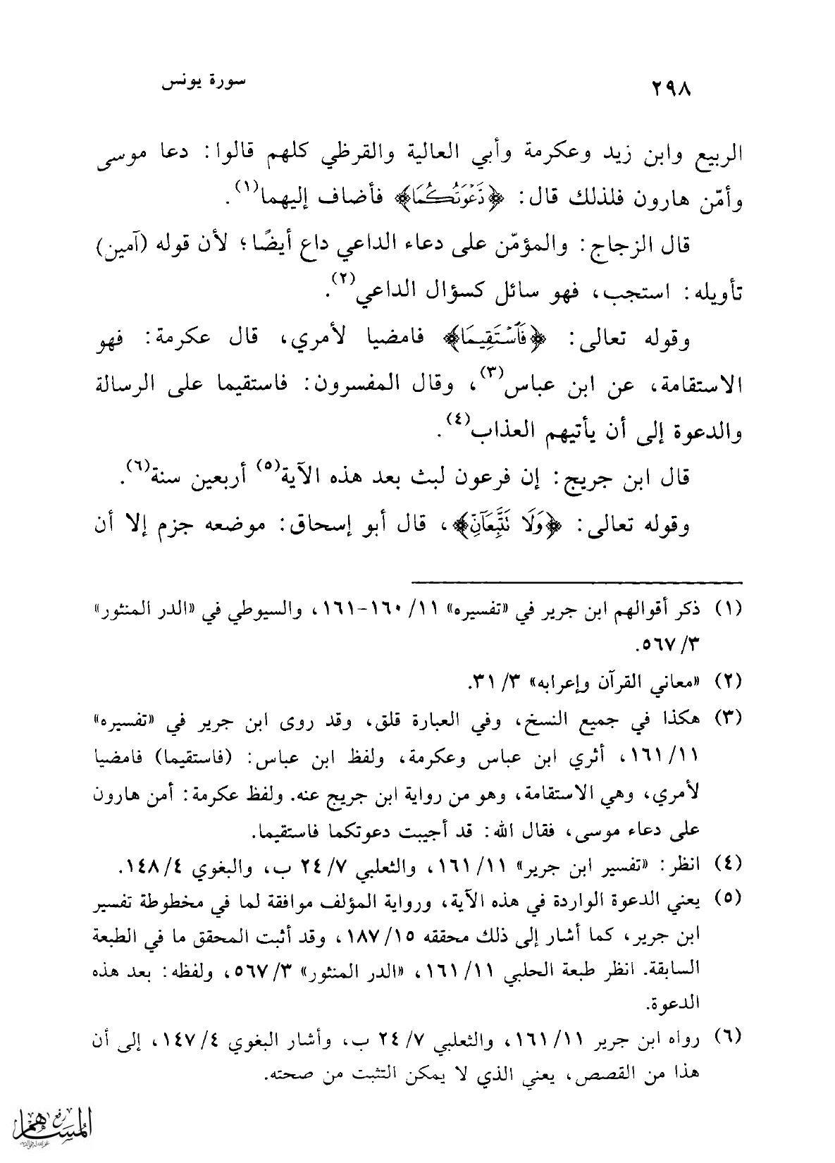 (¬3) هكذا في جميع النسخ، وفي العبارة قلق، وقد روى ابن جرير في "تفسيره" 11/ 161، أثري ابن عباس وعكرمة، ولفظ ابن عباس: (فاستقيما) فامضيا لأمري، وهي الاستقامة، وهو من رواية ابن جريج عنه. ولفظ عكرمة: أمن هارون على دعاء موسى، فقال الله: قد أجيبت دعوتكما فاستقيما.