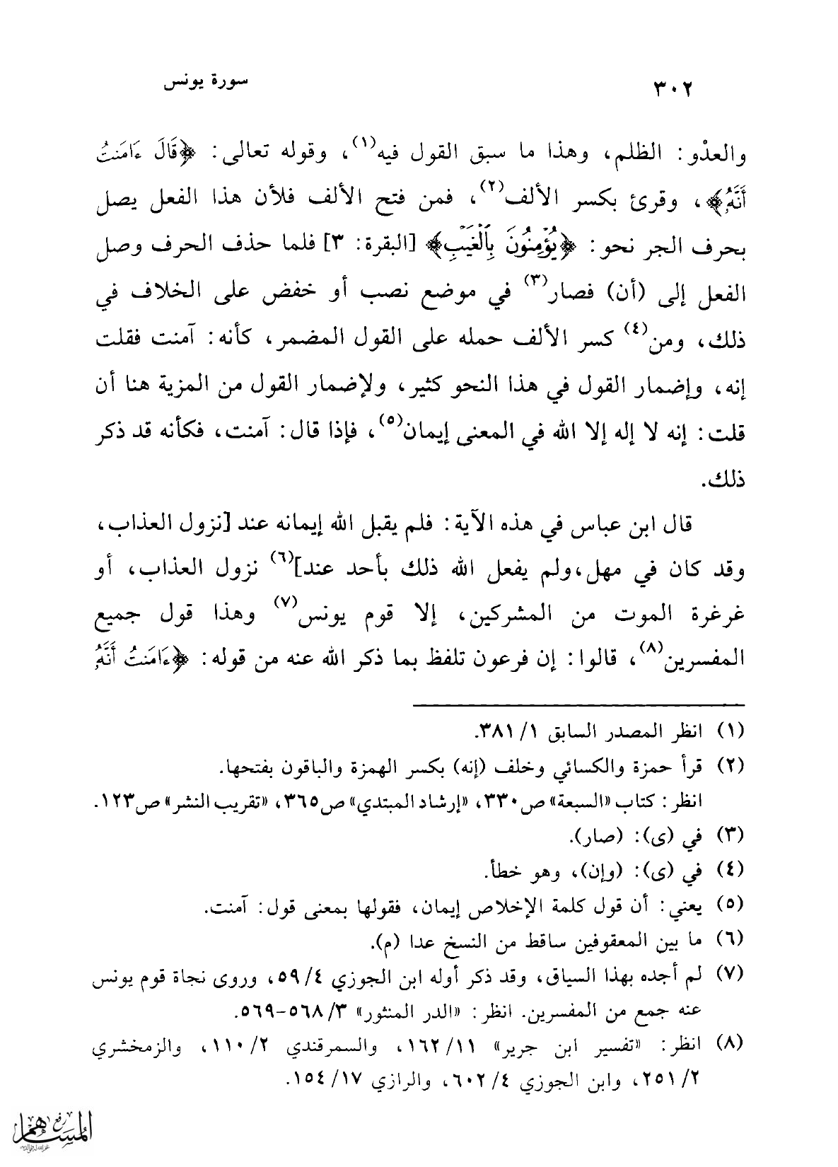 والعدْو: الظلم، وهذا ما سبق القول فيه (¬1)، وقوله تعالى: {قَالَ آمَنْتُ أَنَّهُ}، وقرئ بكسر الألف (¬2)، فمن فتح الألف فلأن هذا الفعل يصل بحرف الجر نحو: {يُؤْمِنُونَ بِالْغَيْبِ} [البقرة: 3] فلما حذف الحرف وصل الفعل إلى (أن) فصار (¬3) في موضع نصب أو خفض على الخلاف في ذلك، ومن (¬4) كسر الألف حمله على القول المضمر، كأنه: آمنت فقلت إنه، وإضمار القول في هذا النحو كثير، ولإضمار القول من المزية هنا أن قلت: إنه لا إله إلا الله في المعنى إيمان (¬5)، فإذا قال: آمنت، فكأنه قد ذكر ذلك.