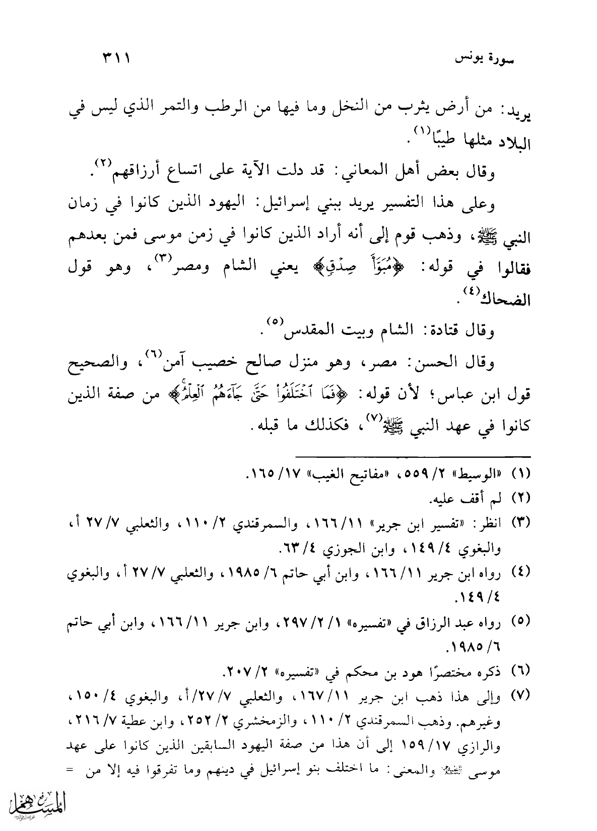 وعلى هذا التفسير يريد ببني إسرائيل: اليهود الذين كانوا في زمان النبي - صلى الله عليه وسلم -، وذهب قوم إلى أنه أراد الذين كانوا في زمن موسى فمن بعدهم فقالوا في قوله: {مُبَوَّأَ صِدْقٍ} يعني الشام ومصر (¬3)، وهو قول الضحاك (¬4).