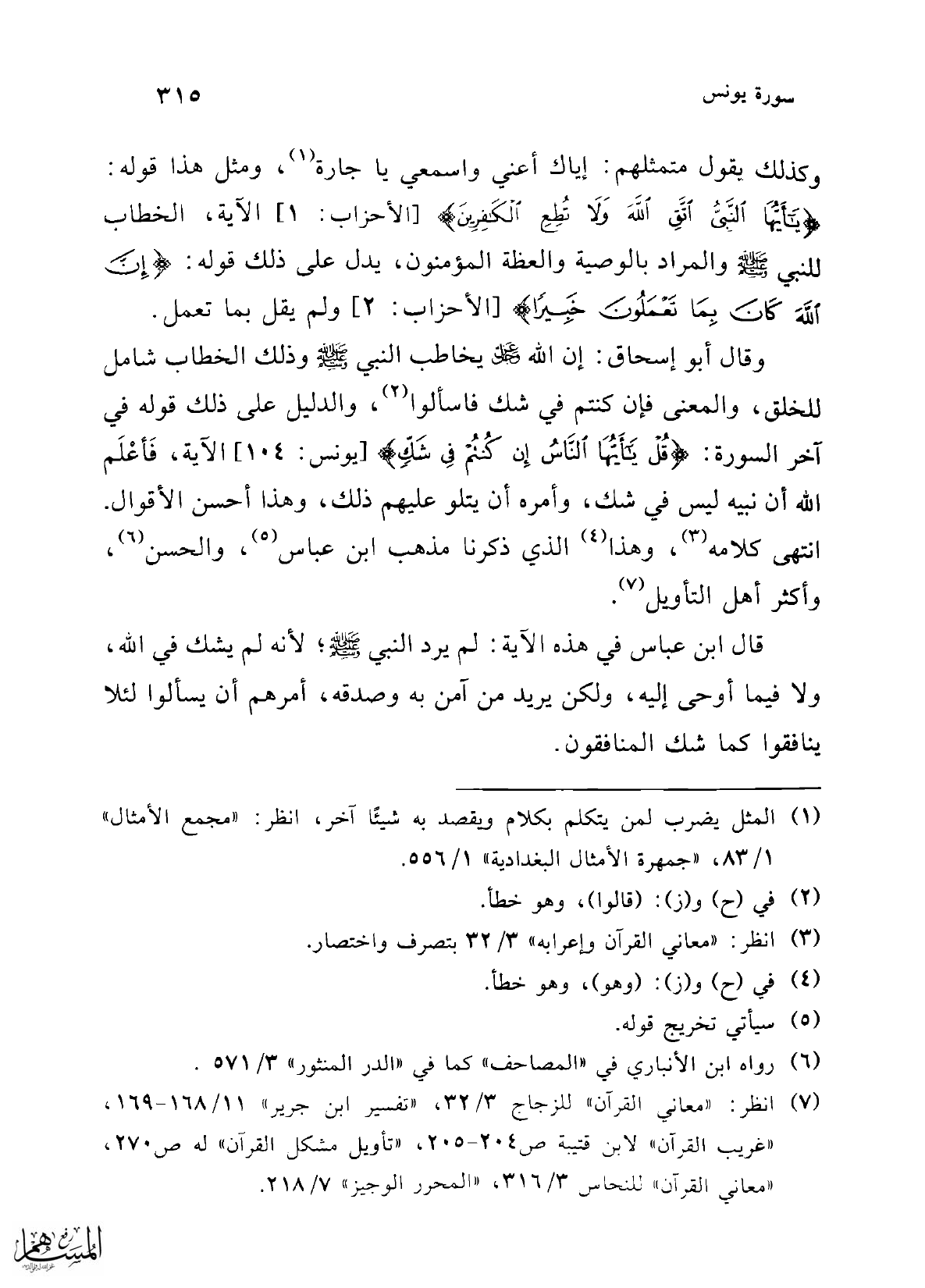 (¬7) انظر: "معاني القرآن" للزجاج 3/ 32، "تفسير ابن جرير" 11/ 168 - 169، "غريب القرآن" لابن قتيبة ص 204 - 205، "تأويل مشكل القرآن" له ص270، "معاني القرآن" للنحاس 3/ 316، "المحرر الوجيز" 7/ 218.