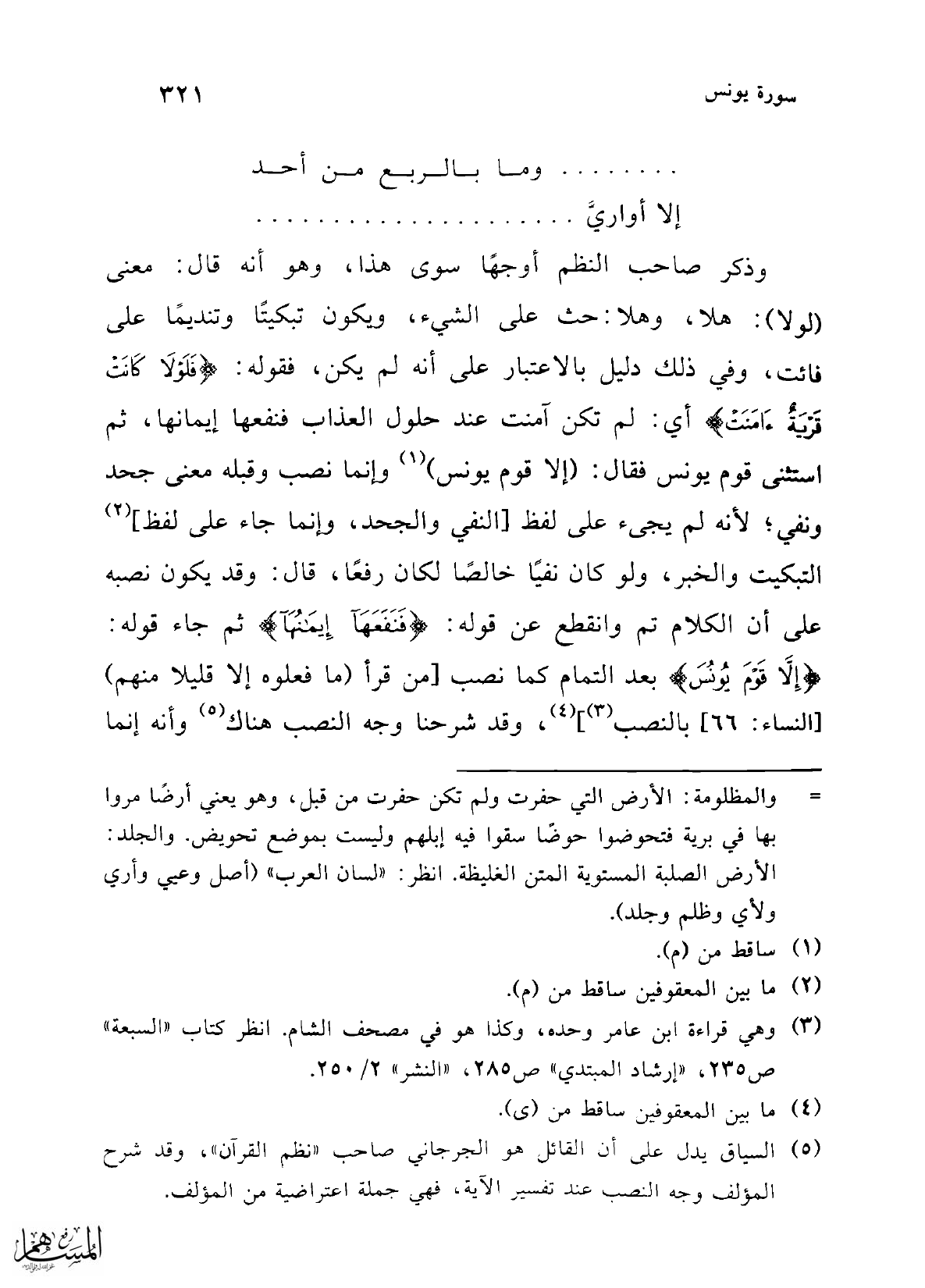 وذكر صاحب النظم أوجهًا سوى هذا، وهو أنه قال: معنى (لولا): هلا، وهلا: حث على الشيء، ويكون تبكيتًا وتنديمًا على فأئت، وفي ذلك دليل بالاعتبار على أنه لم يكن، فقوله: {فَلَوْلَا كَانَتْ قَرْيَةٌ آمَنَتْ} أي: لم تكن آمنت عند حلول العذاب فنفعها إيمانها، ثم استثنى قوم يونس فقال: (إلا قوم يونس) (¬1) وإنما نصب وقبله معنى جحد ونفي؛ لأنه لم يجىء على لفظ [النفي والجحد، وإنما جاء على لفظ] (¬2) التبكيت والخبر، ولو كان نفيًا خالصًا لكان رفعًا، قال: وقد يكون نصبه على أن الكلام تم وانقطع عن قوله: {فَنَفَعَهَا إِيمَانُهَا} ثم جاء قوله: {إِلَّا قَوْمَ يُونُسَ} بعد التمام كما نصب [من قرأ (ما فعلوه إلا قليلا منهم) [النساء: 66] بالنصب (¬3)] (¬4)، وقد شرحنا وجه النصب هناك (¬5) وأنه إنما