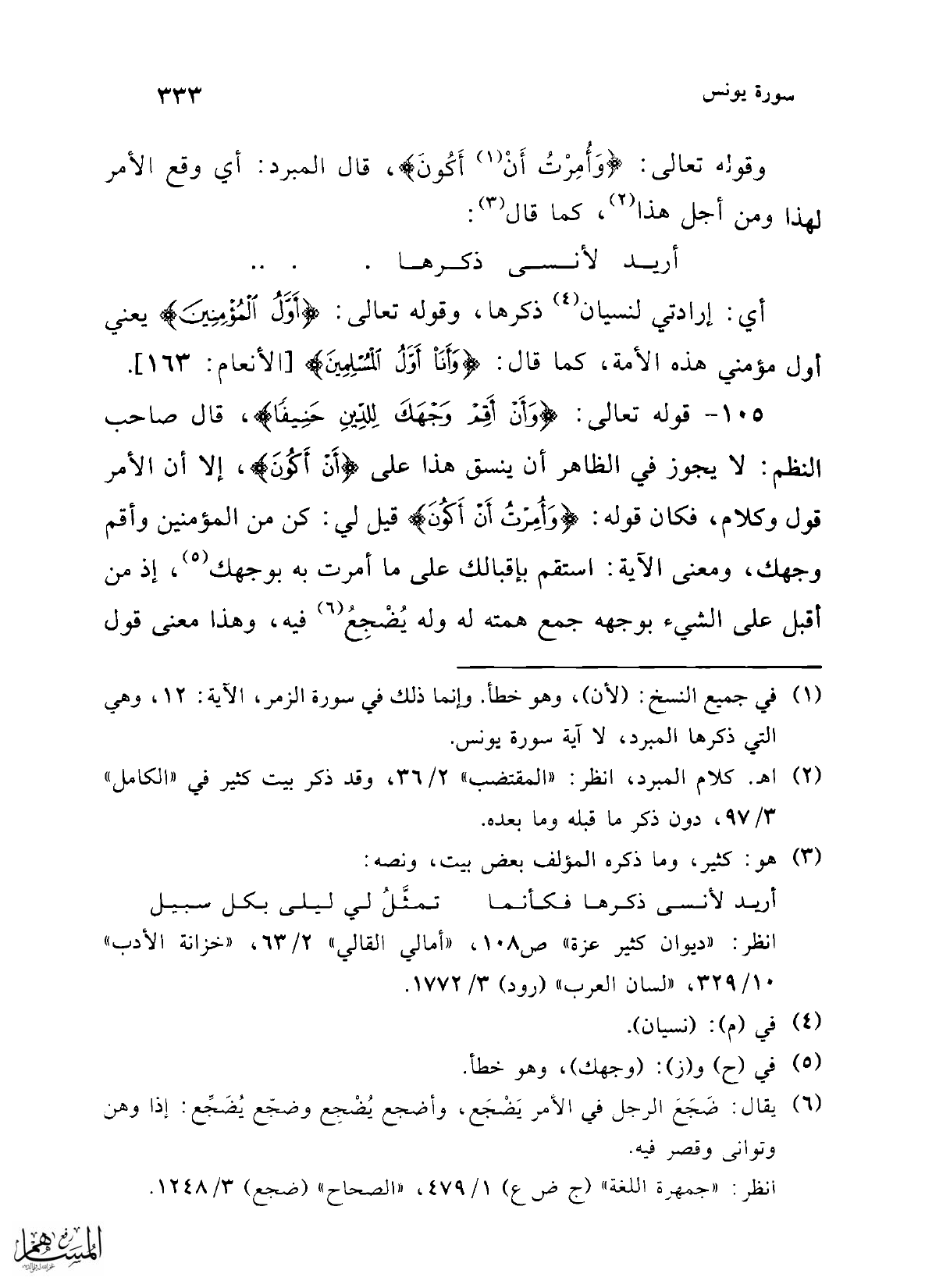 (¬1) في جميع النسخ: (لأن)، وهو خطأ. وإنما ذلك في سورة الزمر، الآية: 12، وهي التي ذكرها المبرد، لا آية سورة يونس.