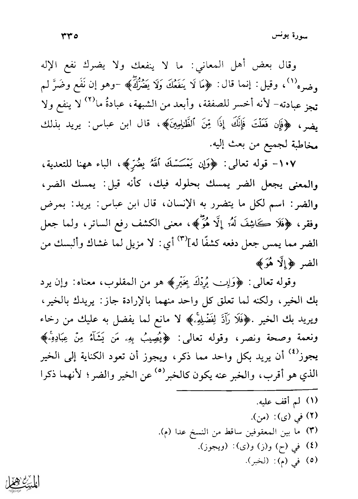 وقوله تعالى: {وَإِنْ يُرِدْكَ بِخَيْرٍ} هو من المقلوب، معناه: وإن يرد بك الخير، ولكنه لما تعلق كل واحد منهما بالإرادة جاز: يريدك بالخير، ويريد بك الخير. {فَلَا رَادَّ لِفَضْلِهِ} لا مانع لما يفضل به عليك من رخاء ونعمة وصحة ونصر، وقوله تعالى: {يُصِيبُ بِهِ مَنْ يَشَاءُ مِنْ عِبَادِهِ} يجوز (¬4) أن يريد بكل واحد مما ذكر، ويجوز أن تعود الكناية إلى الخير الذي هو أقرب، والخبر عنه يكون كالخبر (¬5) عن الخير والضر؛ لأنهما ذكرا
