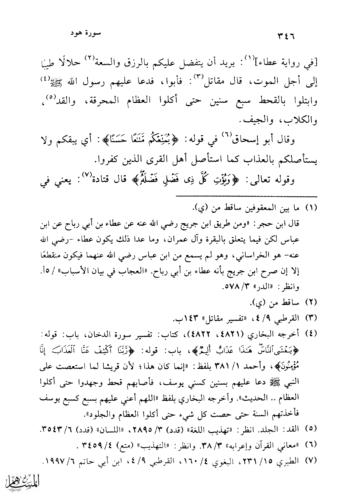 (¬4) أخرجه البخاري (4821، 4822)، كتاب: تفسير سورة الدخان، باب: قوله: {يَغْشَى النَّاسَ هَذَا عَذَابٌ أَلِيمٌ}، باب: قوله: {رَبَّنَا اكْشِفْ عَنَّا الْعَذَابَ إِنَّا مُؤْمِنُونَ}، وأحمد 1/ 381 بلفظ: "إنما كان هذا؛ لأن قريشا لما استعصت على النبي - صلى الله عليه وسلم - دعا عليهم بسنين كسني يوسف، فأصابهم قحط وجهدوا حتى أكلوا العظام .. الحديث". وأخرجه البخاري بلفظ "اللهم أعني عليهم بسبع كسبع يوسف فأخذتهم السنة حتى حصت كل شيء حتى أكلوا العظام والجلود".