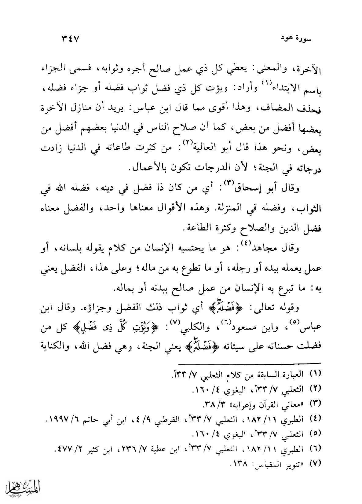 وقوله تعالى: {فَضْلَهُ} أي ثواب ذلك الفضل وجزاؤه. وقال ابن عباس (¬5)، وابن مسعود (¬6)، والكلبي (¬7): {وَيُؤْتِ كُلَّ ذِي فَضْلٍ} كل من فضلت حسناته على سيئاته {فَضْلَهُ} يعني الجنة، وهي فضل الله، والكناية