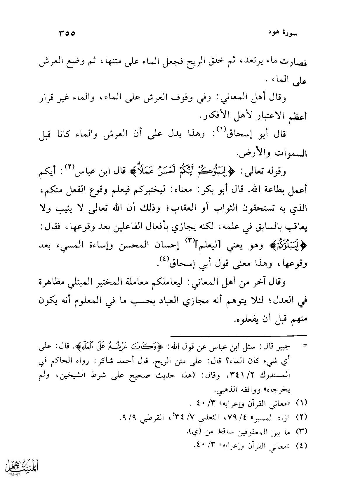 = جبير قال: سئل ابن عباس عن قول الله: {وَكَانَ عَرْشُهُ عَلَى الْمَاءِ}. قال: على أي شيء كان الماء؟ قال: على متن الريح. قال أحمد شاكر: رواه الحاكم في المستدرك 2/ 341، وقال: (هذا حديث صحيح على شرط الشيخين، ولم يخرجاه) ووافقه الذهبي.