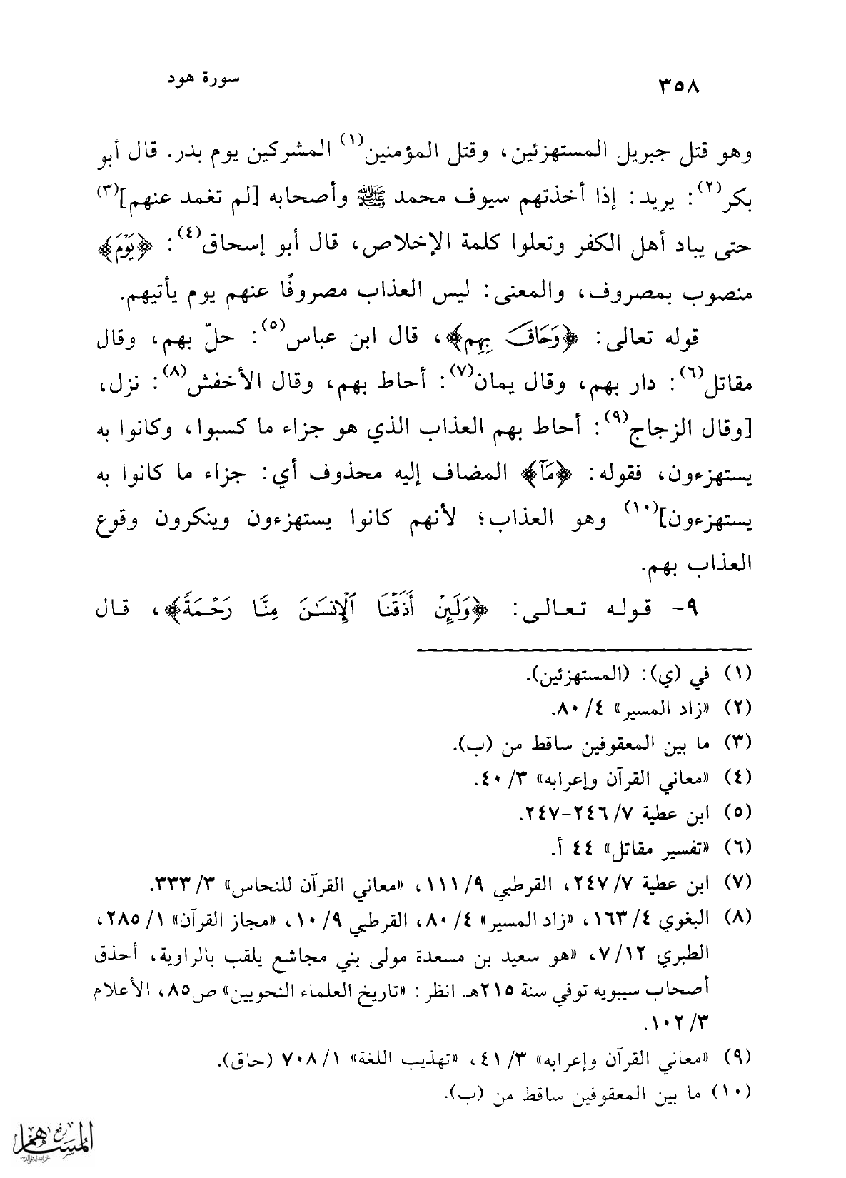 (¬8) البغوي 4/ 163، "زاد المسير" 4/ 80، القرطبي 9/ 10، "مجاز القرآن" 1/ 285، الطبري 12/ 7، "هو سعيد بن مسعدة مولى بني مجاشع يلقب بالراوية، أحذق أصحاب سيبويه توفي سنة 215 هـ. انظر: "تاريخ العلماء النحويين" ص 85، الأعلام 3/ 102.