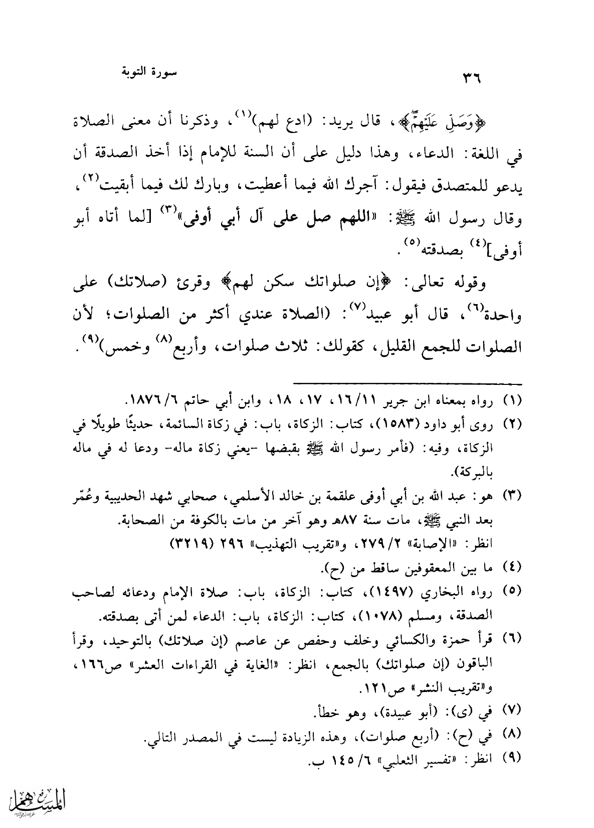 {وَصَلِّ عَلَيْهِمْ}، قال يريد: (ادع لهم) (¬1)، وذكرنا أن معنى الصلاة في اللغة: الدعاء، وهذا دليل على أن السنة للإمام إذا أخذ الصدقة أن يدعو للمتصدق فيقول: آجرك الله فيما أعطيت، وبارك لك فيما أبقيت (¬2)، وقال رسول الله -صلى الله عليه وسلم-: "اللهم صل على آل أبي أوفى" (¬3) [لما أتاه أبو أوفى] (¬4) بصدقته (¬5).
