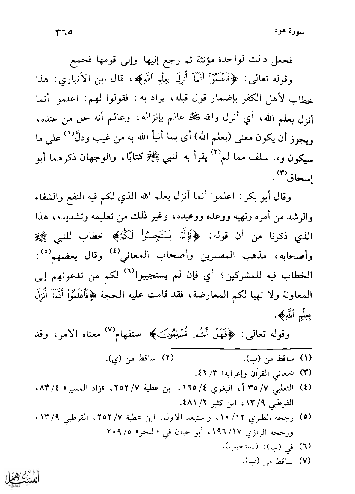 وقال أبو بكر: اعلموا أنما أنزل بعلم الله الذي لكم فيه النفع والشفاء والرشد من أمره ونهيه ووعده ووعيده، وغير ذلك من تعليمه وتشديده، هذا الذي ذكرنا من أن قوله: {فَإِلَّمْ يَسْتَجِيبُوا لَكُمْ} خطاب للنبي - صلى الله عليه وسلم - وأصحابه، مذهب المفسرين وأصحاب المعاني (¬4) وقال بعضهم (¬5): الخطاب فيه للمشركين؛ أي فإن لم يستجيبوا (¬6) لكم من تدعونهم إلى المعاونة ولا تهيأ لكم المعارضة، فقد قامت عليه الحجة {فَاعْلَمُوا أَنَّمَا أُنْزِلَ بِعِلْمِ اللَّهِ}.