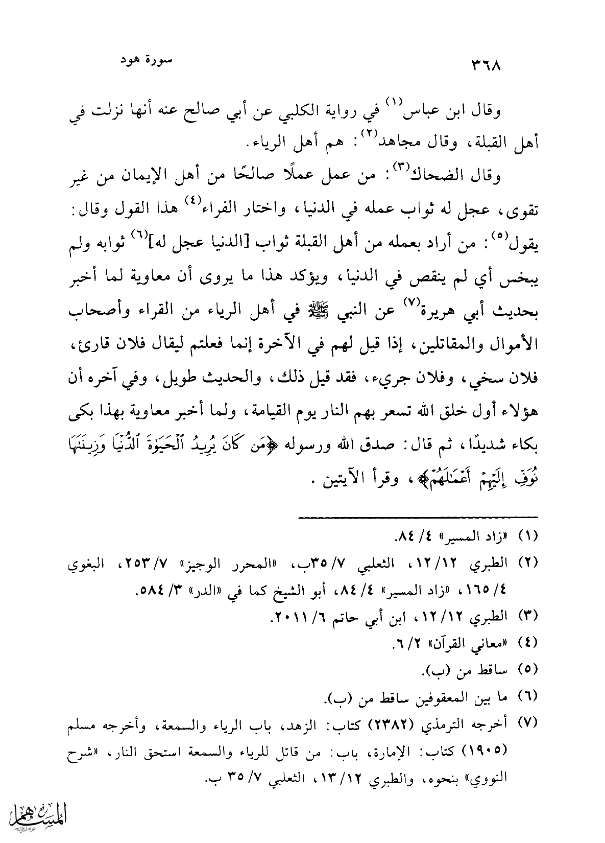 (¬7) أخرج الترمذي (2382) كتاب: الزهد، باب الرياء والسمعة، وأخرجه مسلم (1905) كتاب: الإمارة، باب: من قاتل للرياء والسمعة استحق النار، "شرح النووي" بنحوه، والطبري 12/ 13، الثعلبي 7/ 35 ب.