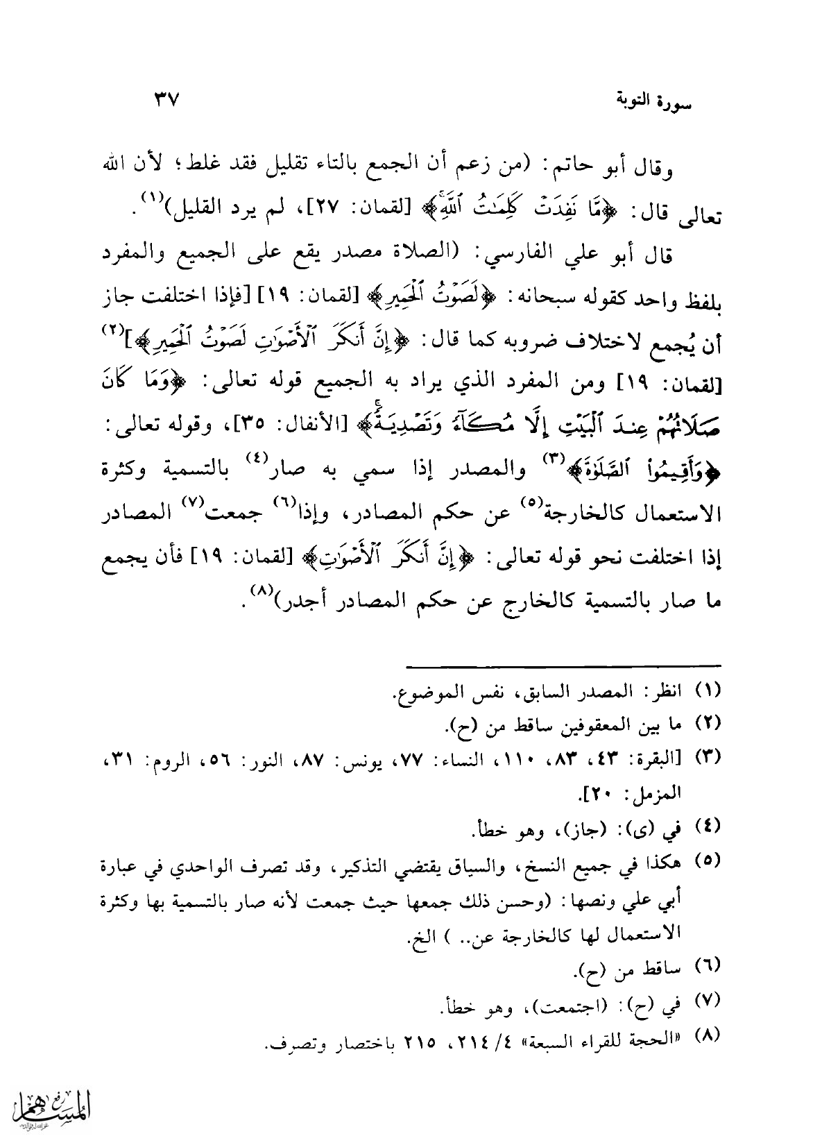 (¬8) "الحجة للقراء السبعة" 4/ 214، 215 باختصار وتصرف.