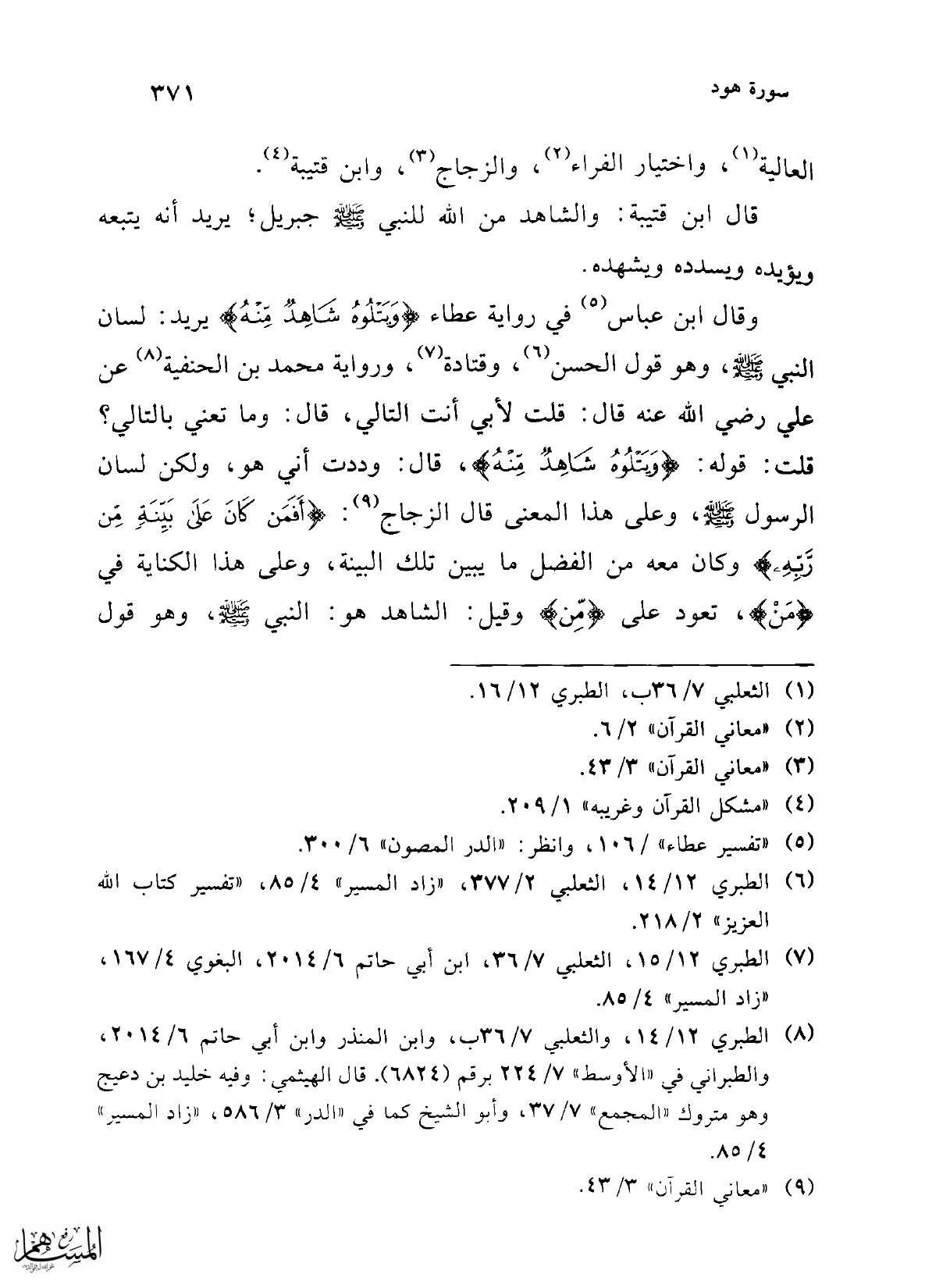 وقال ابن عباس (¬5) في رواية عطاء {وَيَتْلُوهُ شَاهِدٌ مِنْهُ} يريد: لسان النبي - صلى الله عليه وسلم -، وهو قول الحسن (¬6)، وقتادة (¬7)، ورواية محمد بن الحنفية (¬8) عن علي رضي الله عنه قال: قلت لأبي أنت التالي، قال: وما تعني بالتالي؟ قلت: قوله: {وَيَتْلُوهُ شَاهِدٌ مِنْهُ}، قال: وددت أني هو، ولكن لسان الرسول - صلى الله عليه وسلم -، وعلى هذا المعنى قال الزجاج (¬9): {أَفَمَنْ كَانَ عَلَى بَيِّنَةٍ مِنْ رَبِّهِ} وكان معه من الفضل ما يبين تلك البينة، وعلى هذا الكناية في {مَنْ}، تعود على {مِّن} وقيل: الشاهد هو: النبي - صلى الله عليه وسلم -، وهو قول