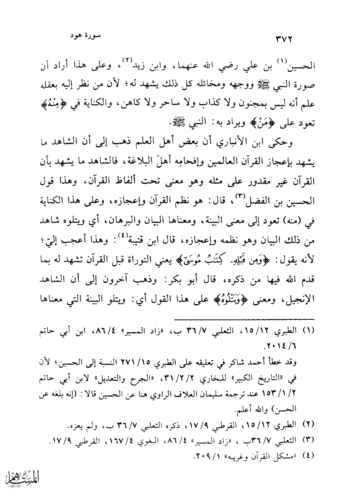 وحكى ابن الأنباري أن بعض أهل العلم ذهب إلى أن الشاهد ما يشهد بإعجاز القرآن العالمين وإفحامِه أهلَ البلاغة، فالشاهد ما يشهد بأن القرآن غير مقدور على مثله وهو معنى تحت ألفاظ القرآن، وهذا قول الحسين بن الفضل (¬3)، قال: هو نظم القرآن وإعجازه، وعلى هذا الكناية في (منه) تعود إلى معنى البينة، ومعناها البيان والبرهان، أي ويتلوه شاهد من ذلك البيان وهو نظمه وإعجازه، قال ابن قتيبة (¬4): وهذا أعجب إليّ؛ لأنه يقول: {وَمِنْ قَبْلِهِ كِتَابُ مُوسَى} يعني التوراة قبل القرآن تشهد له بما قدم الله فيها من ذكره، قال أبو بكر: وذهب آخرون إلى أن الشاهد الإنجيل، ومعنى {وَيَتْلُوهُ} على هذا القول أي: ويتلو البينة التي معناها