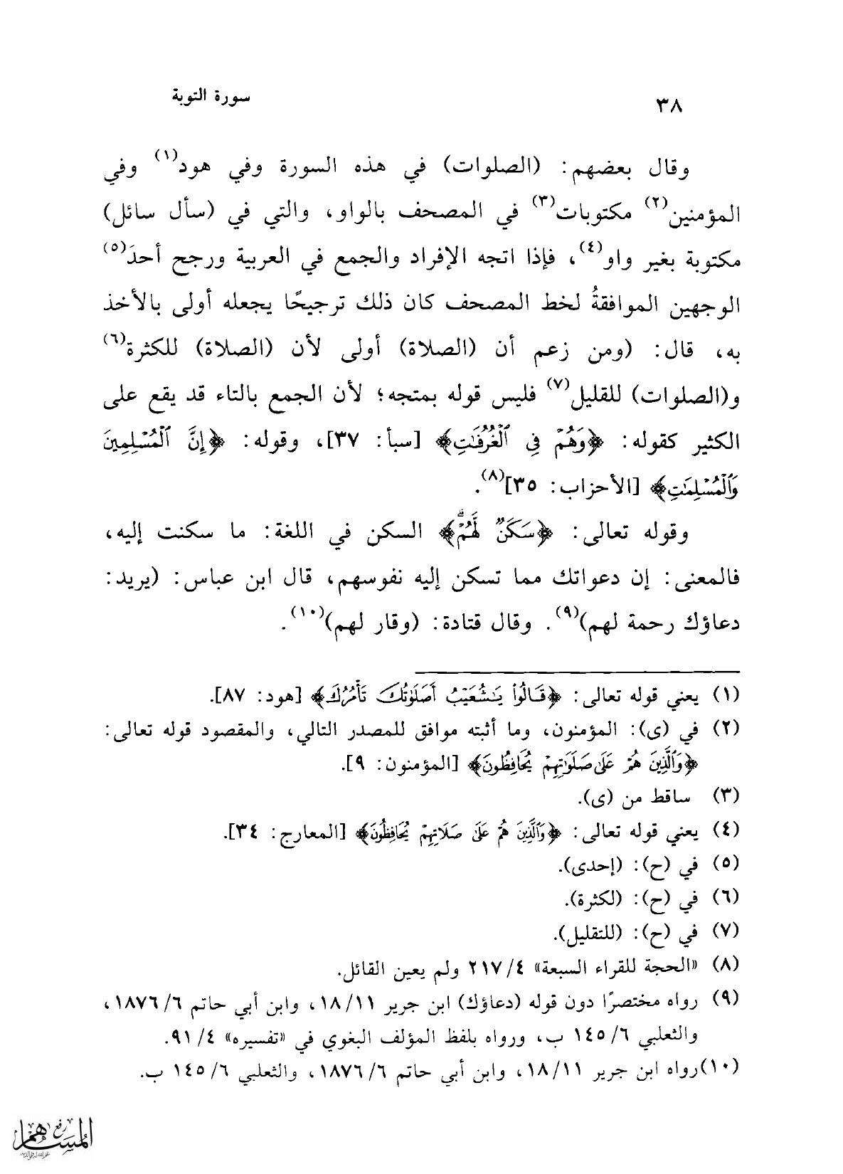 وقال بعضهم: (الصلوات) في هذه السورة وفي هود (¬1) وفي المؤمنين (¬2) مكتوبات (¬3) في المصحف بالواو، والتي في (سأل سائل) مكتوبة بغير واو (¬4)، فإذا اتجه الإفراد والجمع في العربية ورجح أحدَ (¬5) الوجهين الموافقةُ لخط المصحف كان ذلك ترجيحًا يجعله أولى بالأخذ به، قال: (ومن زعم أن (الصلاة) أولى لأن (الصلاة) للكثرة (¬6) و (الصلوات) للقليل (¬7) فليس قوله بمتجه؛ لأن الجمع بالتاء قد يقع على الكثير كقوله: {وَهُمْ فِي الْغُرُفَاتِ} [سبأ: 37]، وقوله: {إِنَّ الْمُسْلِمِينَ وَالْمُسْلِمَاتِ} [الأحزاب: 35] (¬8).