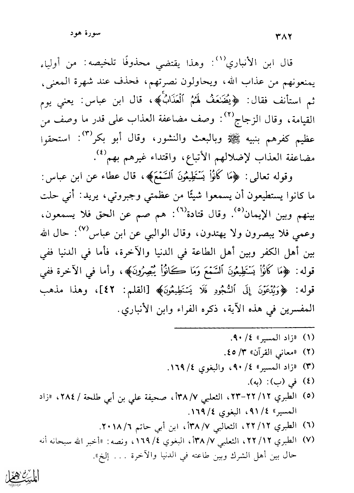 قال ابن الأنباري (¬1): وهذا يقتضي محذوفًا تلخيصه: من أولياء يمنعونهم من عذاب الله، ويحاولون نصرتهم، فحذف عند شهرة المعنى، ثم استأنف فقال: {يُضَاعَفُ لَهُمُ الْعَذَابُ}، قال ابن عباس: يعني يوم القيامة، وقال الزجاج (¬2): وصف مضاعفة العذاب على قدر ما وصف من عظيم كفرهم بنبيه - صلى الله عليه وسلم - وبالبعث والنشور، وقال أبو بكر (¬3): استحقوا مضاعفة العذاب لإضلالهم الأتباع، واقتداء غيرهم بهم (¬4).