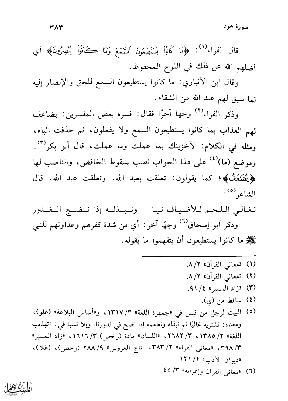 وذكر الفراء (¬2) وجها آخرًا فقال: فسره بعض المفسرين: يضاعف لهم العذاب بما كانوا يستطيعون السمع ولا يفعلون، ثم حذفت الباء، ومثله في الكلام: لأخزينك بما عملت وما عملت، قال أبو بكر (¬3): وموضع (ما) (¬4) على هذا الجواب نصب بسقوط الخافض، والناصب لها {يُضَاعَفُ}؛ كما يقولون: تعلقت بعبد الله، وتعلقت عبد الله، قال الشاعر (¬5):