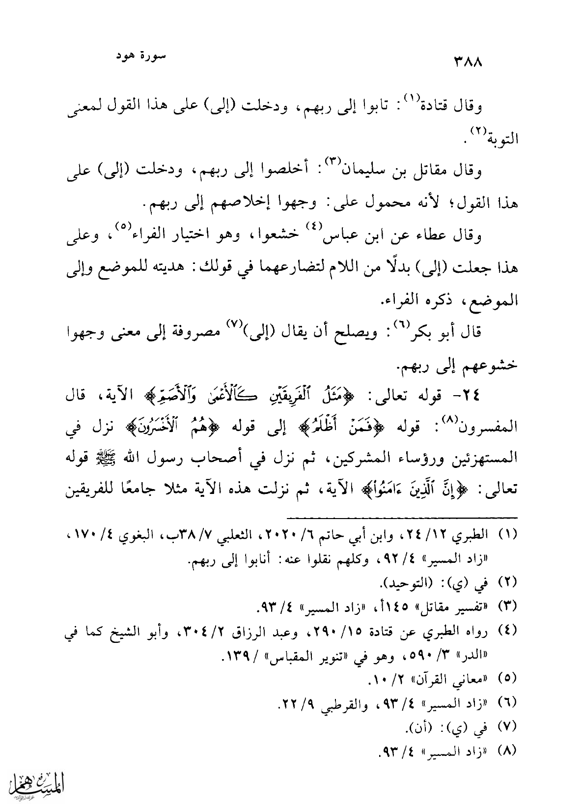 (¬1) الطبري 12/ 24، وابن أبي حاتم 6/ 2020، الثعلبي 7/ 38 ب، البغوي 4/ 170، "زاد المسير" 4/ 92، وكلهم نقلوا عنه: أنابوا إلى ربهم.