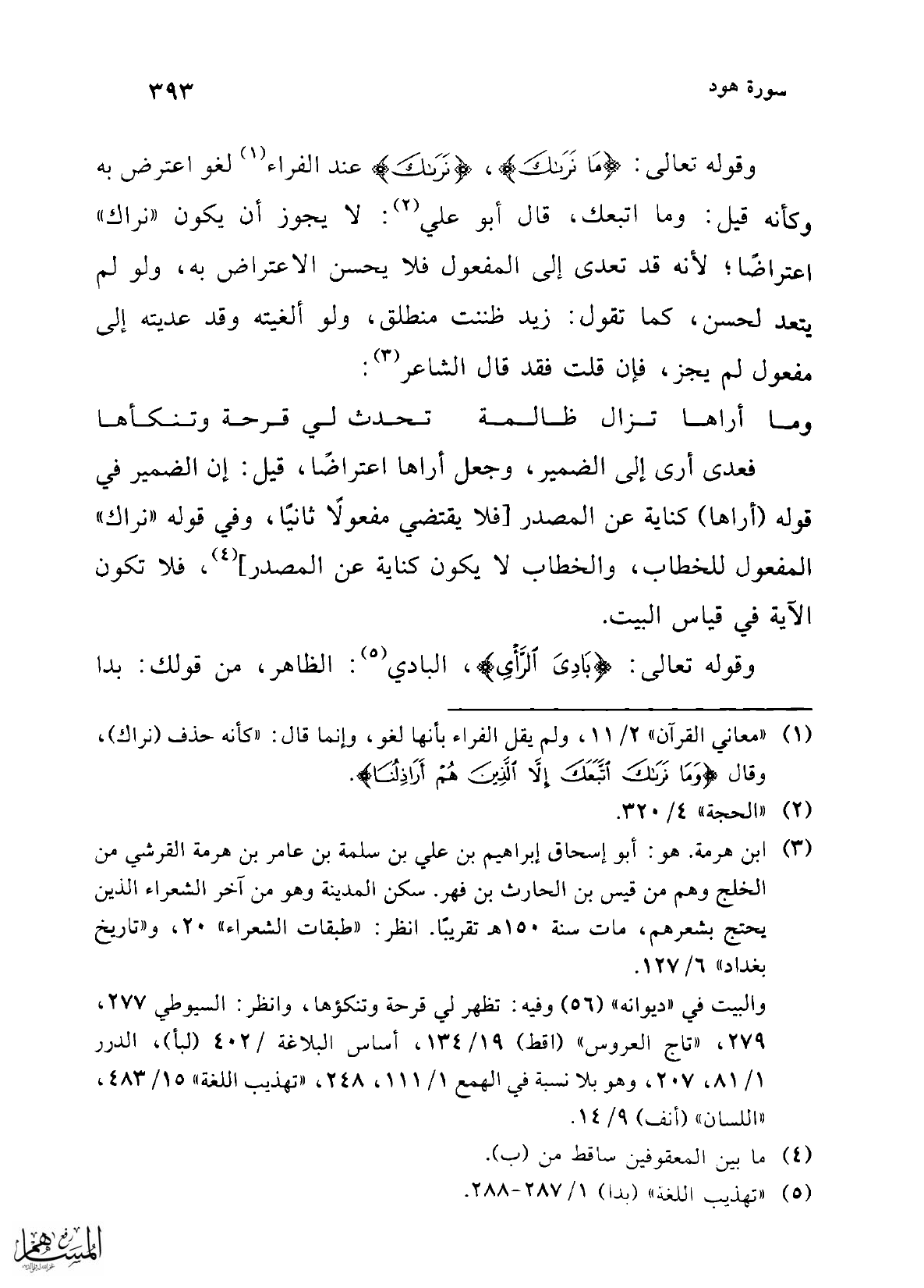 (¬1) "معاني القرآن" 2/ 11، ولم يقل الفراء بأنها لغو، وإنما قال: "كأنه حذف (نراك)، وقال {وَمَا نَرَاكَ اتَّبَعَكَ إِلَّا الَّذِينَ هُمْ أَرَاذِلُنَا}.