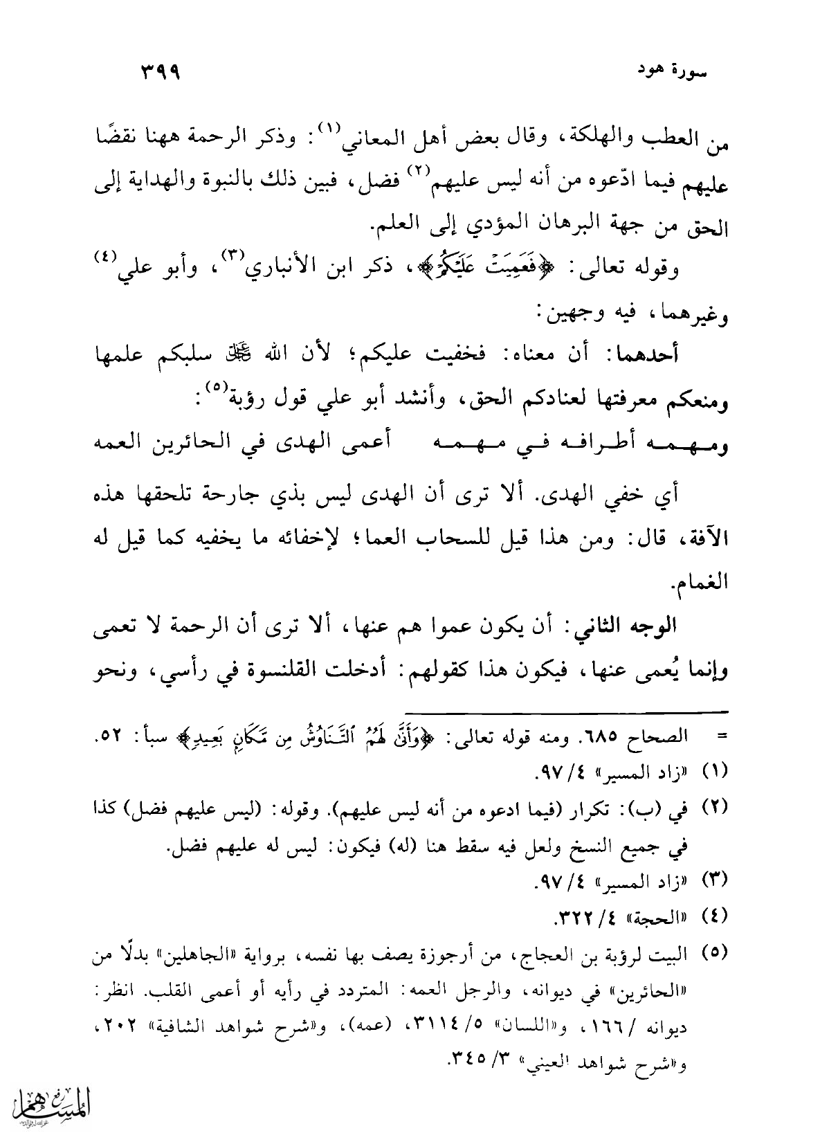 (¬5) البيت لرؤبة بن العجاج، من أرجوزة يصف بها نفسه، برواية "الجاهلين" بدلاً من "الحائرين" في ديوانه، والرجل العمه: المتردد في رأيه أو أعمى القلب. انظر: ديوانه / 166، و"اللسان" 5/ 3114، (عمه)، و"شرح شواهد الشافية" 202، و"شرح شواهد العيني" 3/ 345.