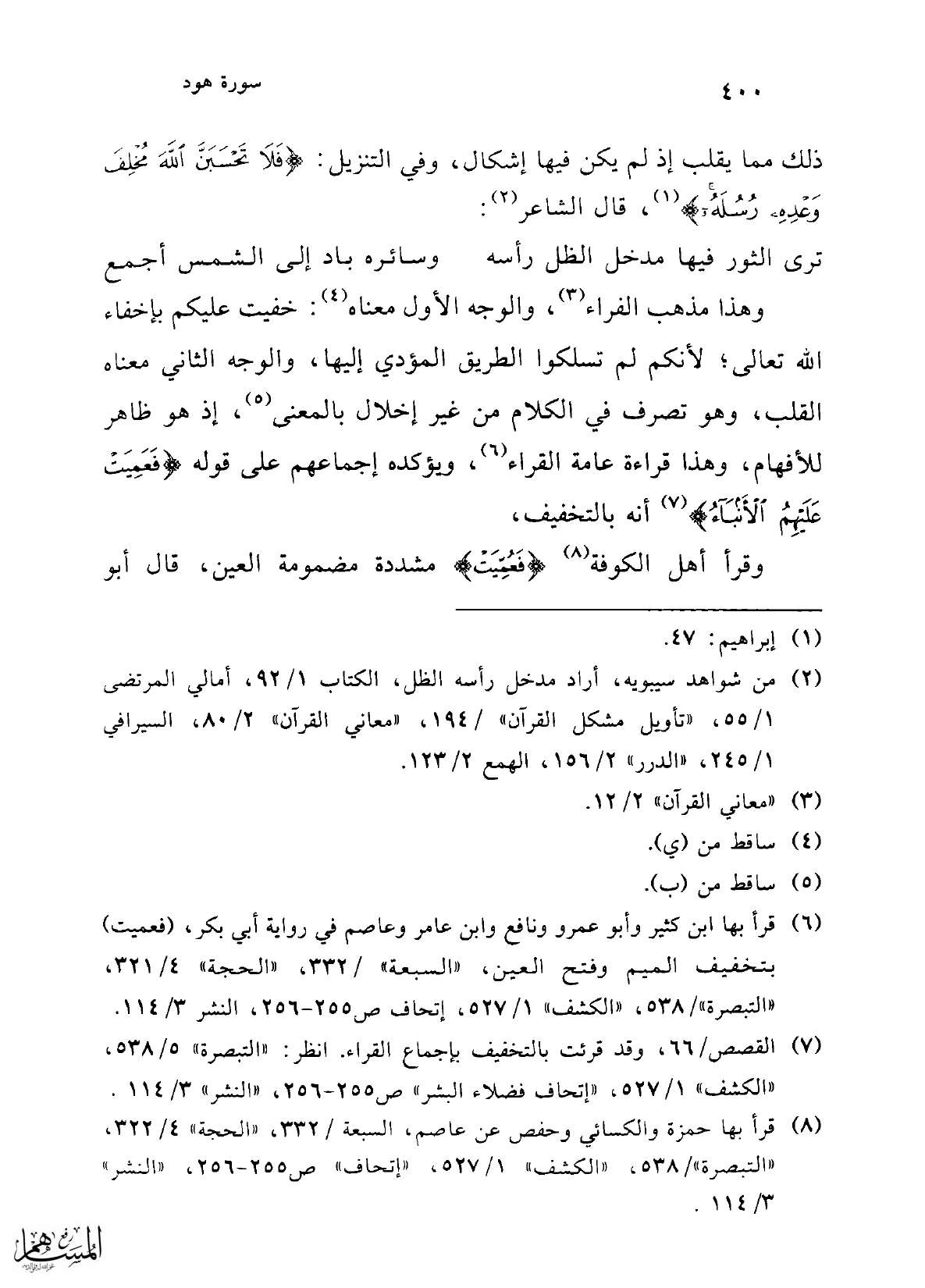 (¬6) قرأ بها ابن كثير وأبو عمرو ونافع وابن عامر وعاصم في رواية أبي بكر، (فعميت) بتخفيف الميم وفتح العين، "السبعة" /332، "الحجة" 4/ 321، "التبصرة" / 538، "الكشف" 1/ 527، إتحاف ص 255 - 256، النشر 3/ 114.