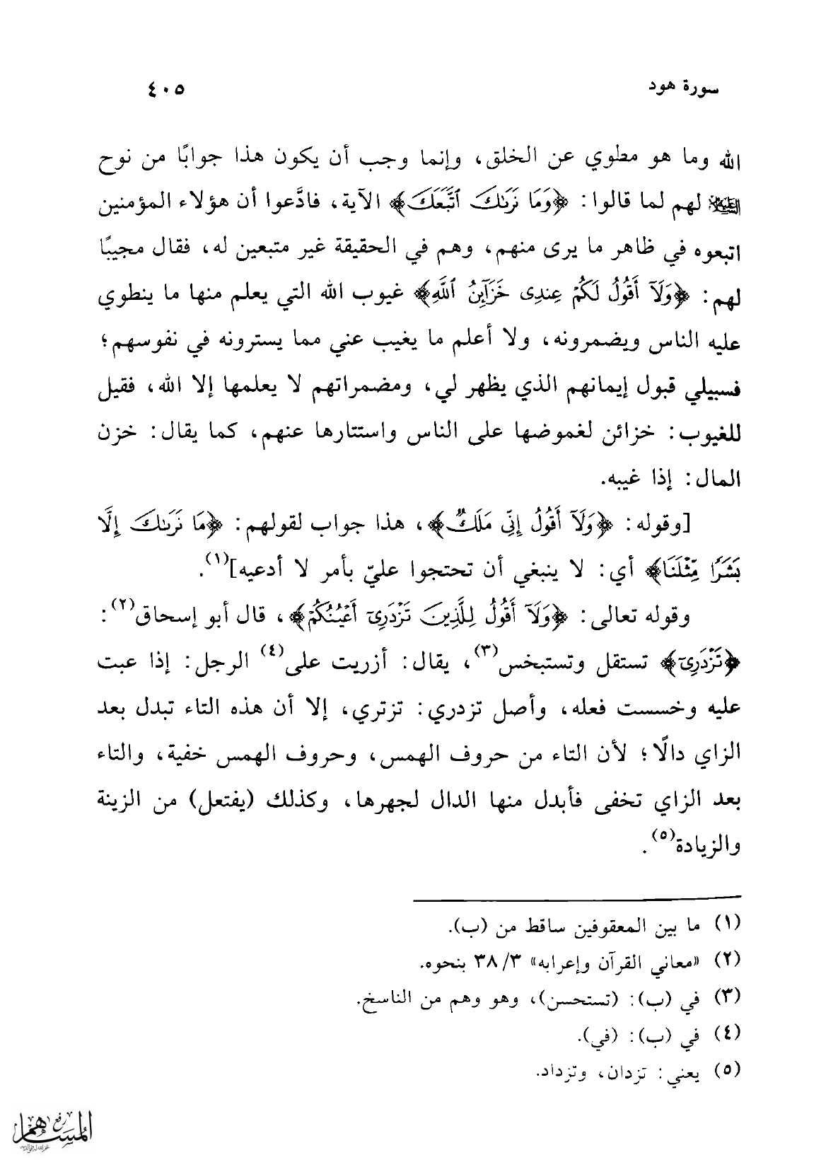 وقوله تعالى: {وَلَا أَقُولُ لِلَّذِينَ تَزْدَرِي أَعْيُنُكُمْ}، قال أبو إسحاق (¬2): {تَزْدَرِي} تستقل وتستبخس (¬3)، يقال: أزريت على (¬4) الرجل: إذا عبت عليه وخسست فعله، وأصل تزدري: تزتري، إلا أن هذه التاء تبدل بعد الزاي دالاً؛ لأن التاء من حروف الهمس، وحروف الهمس خفية، والتاء بعد الزاي تخفى فأبدل منها الدال لجهرها، وكذلك (يفتعل) من الزينة والزيادة (¬5).