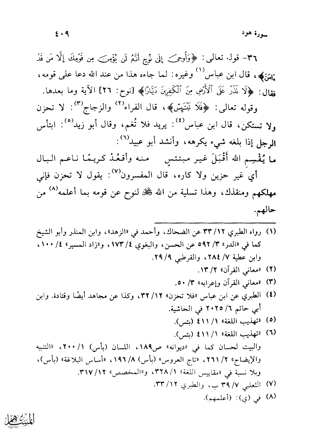 أي غير حزين ولا كاره، قال المفسرون (¬7): يقول لا تحزن فإني مهلكهم ومنقذك، وهذا تسلية من الله عز وجل لنوح عن قومه بما أعلمه (¬8) من حالهم.