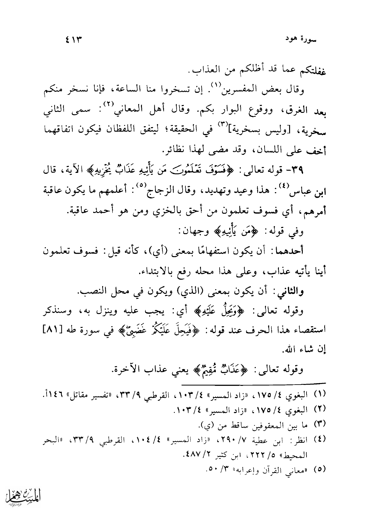 39 - قوله تعالى: {فَسَوْفَ تَعْلَمُونَ مَنْ يَأْتِيهِ عَذَابٌ يُخْزِيهِ} الآية، قال ابن عباس (¬4): هذا وعيد وتهديد، وقال الزجاج (¬5): أعلمهم ما يكون عاقبة أمرهم، أي فسوف تعلمون من أحق بالخزي ومن هو أحمد عاقبة.