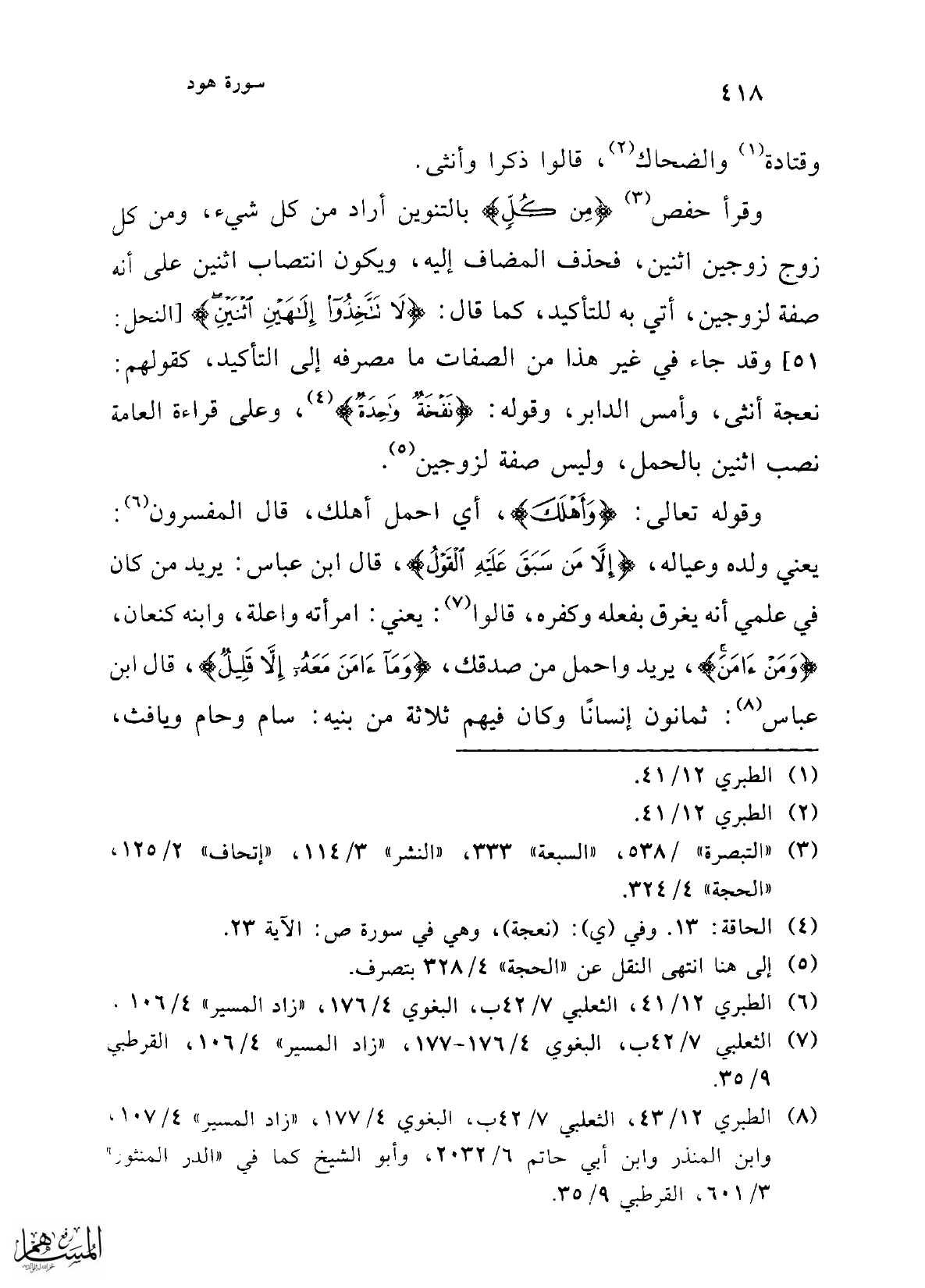 وقرأ حفص (¬3) {مِن كُلٍّ} بالتنوين أراد من كل شيء، ومن كل زوج زوجين اثنين، فحذف المضاف إليه، ويكون انتصاب اثنين على أنه صفة لزوجين، أتي به للتأكيد، كما قال: {لَا تَتَّخِذُوا إِلَهَيْنِ اثْنَيْنِ} [النحل: 51] وقد جاء في غير هذا من الصفات ما مصرفه إلى التأكيد، كقولهم: نعجة أنثى، وأمس الدابر، وقوله: {نَفْخَةٌ وَاحِدَةٌ} (¬4)، وعلى قراءة العامة نصب اثنين بالحمل، وليس صفة لزوجين (¬5).