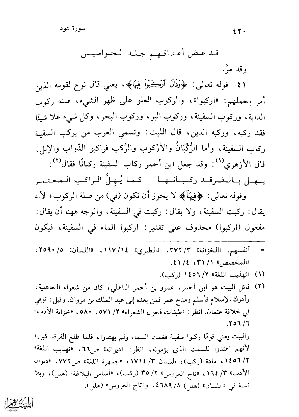 41 - قوله تعالى: {وَقَالَ ارْكَبُوا فِيهَا}، يعني قال نوخ لقومه الذين أمر بحملهم: "اركبوا"، والركوب العلو على ظهر الشيء، فمنه ركوب الدابة، وركوب السفينة، وركوب البر، وركوب البحر، وكل شيء علا شيئاً فقد ركبه، وركبه الدين، قال الليث: وتسمي العرب من يركب السفينة ركاب السفينة، وأما الرُّكْبَانُ والأرْكوب والرَّكب فراكبو الدّواب والإبل، قال الأزهري (¬1): وقد جعل ابن أحمر ركاب السفينة ركباناً فقال (¬2):