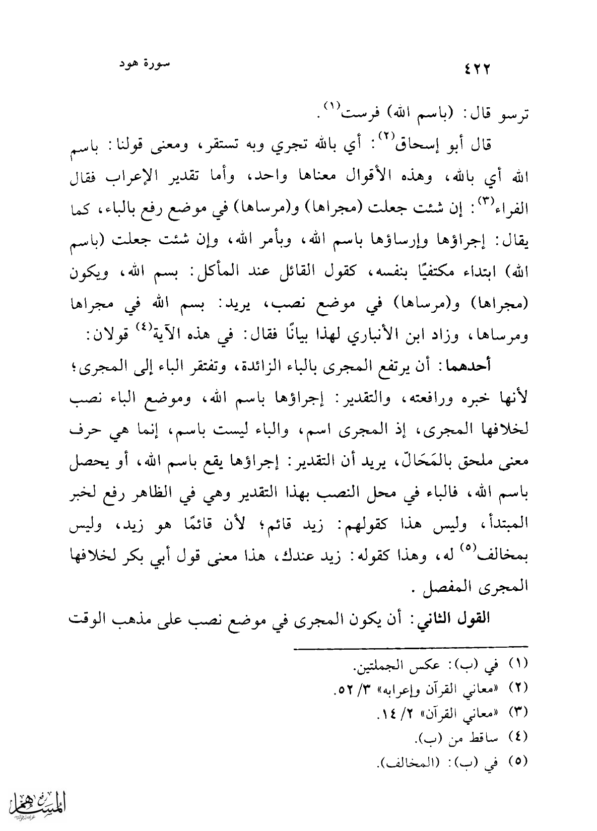 أحدهما: أن يرتفع المجرى بالباء الزائدة، وتفتقر الباء إلى المجرى؛ لأنها خبره ورافعته، والتقدير: إجراؤها باسم الله، وموضع الباء نصب لخلافها المجرى، إذ المجرى اسم، والباء ليست باسم، إنما هي حرف معنى ملحق بالمَحَالّ، يريد أن التقدير: إجراؤها يقع باسم الله، أو يحصل باسم الله، فالباء في محل النصب بهذا التقدير وهي في الظاهر رفع لخبر المبتدأ، وليس هذا كقولهم: زيد قائم؛ لأن قائمًا هو زيد، وليس بمخالف (¬5) له، وهذا كقوله: زيد عندك، هذا معنى قول أبي بكر لخلافها المجرى المفصل.
